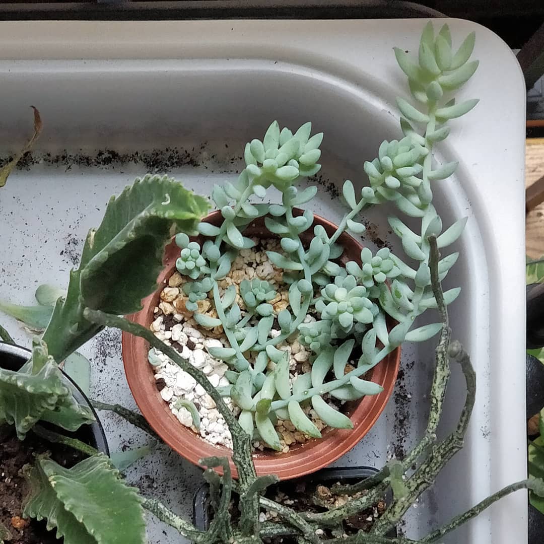 This is a small Burro’s Tail succulent grown from a few small leaf propagations. Notice how it’s not quite as full looking as when they’re grown in the nursery. I’ve simply accepted that this is the character of the plant when grown under my skylight. 📷 2) Look how a whole new plant begins from a single fallen leaf!