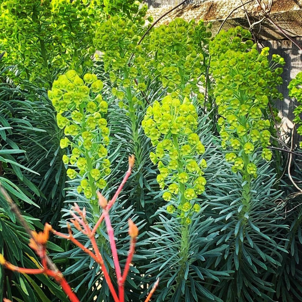 @kategouldgardens: Vibrant Euphorbia with a sneaky Cornus in the corner. .