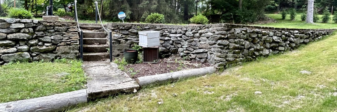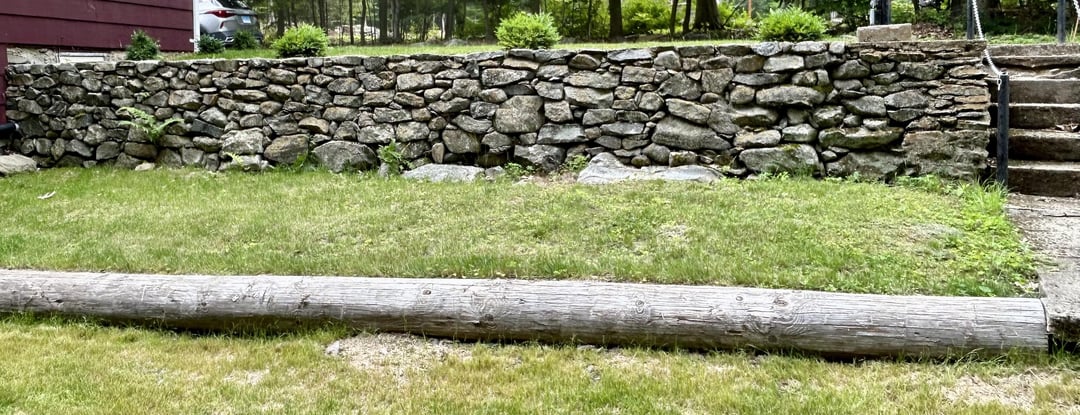 The stone wall itself is a feature, so don’t try to cover it up. I suppose you could draw attention to the wall with some curving flower beds and colorful flowers, and some lights at night. But realize you have a beautiful, healthy stone wall that a lot of people would die for.