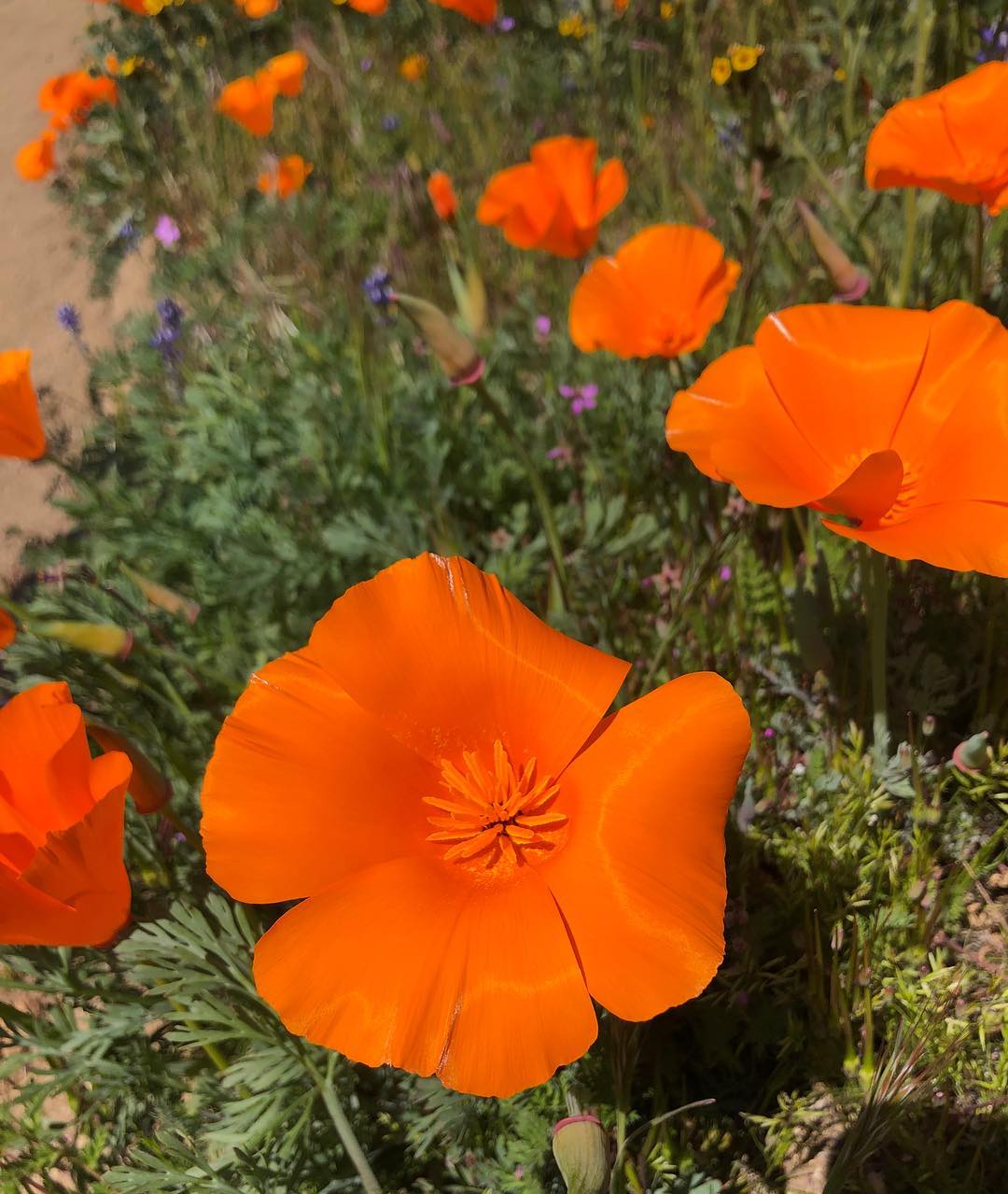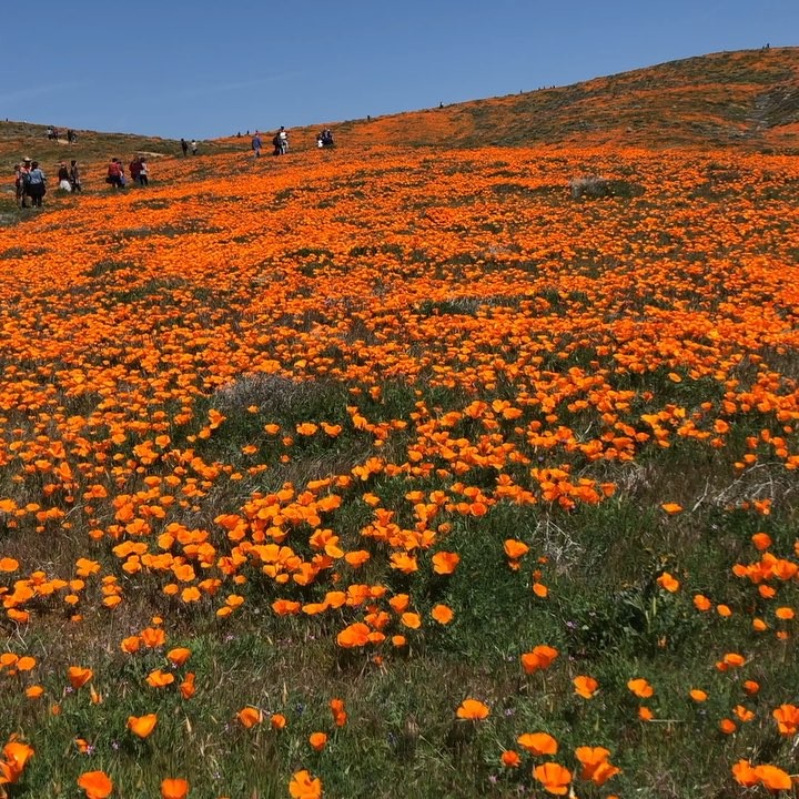 Poppies galore! Thanks to last winter’s abundant rainfall, the curvaceous Antelope Valley Poppy Reserve is now blanketed with neon orange #Californiapoppies 🧡🧡🧡🧡 Crowds are massive, so get there early (although poppies don’t fully open until later in the AM) and 💥stay on the trail💥 #thehillsarealive #superbloom #eschscholziacalifornica