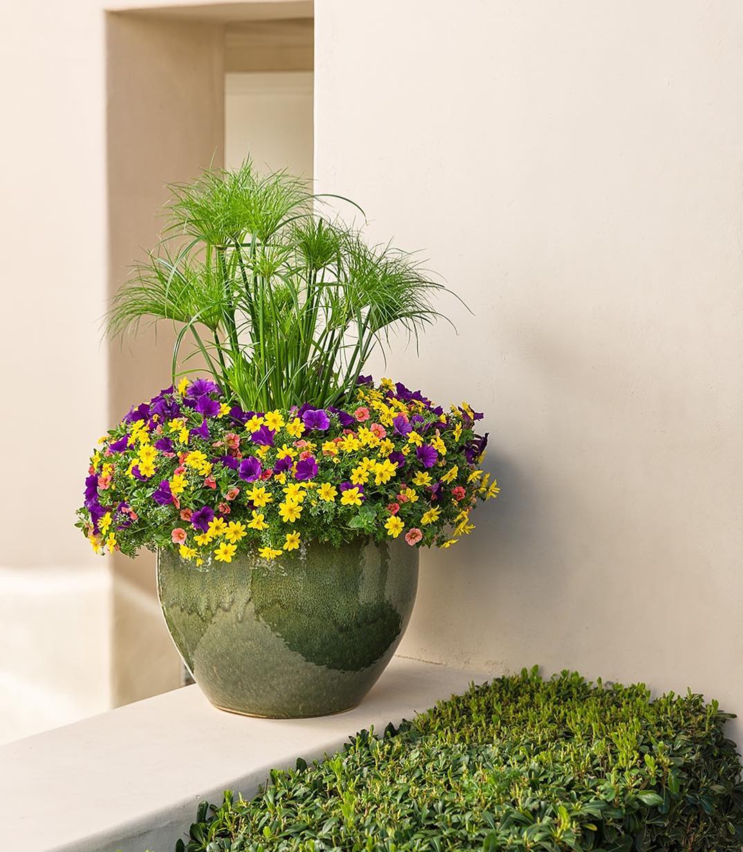 Pictured: Summerfest Flower Pillow is pre-planted with: Goldilocks Rocks Bidens, Superbells Coralina Calibrachoa, and Supertunia Royal Velvet Petunia. Tip: You can make them your own by adding a thriller, like Graceful Grasses Prince Tut 😍