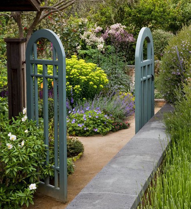 Sneak Peek: Designer Gary Ratway borrowed the design of this arched double gate from the shape of the windows and the trim color of this landscape’s home in coastal California. The gate serves as the transition from the side yard to the backyard and keeps deer out. The gate was hand-built by artisan Eric Lassotovitch with black acacia wood. Photo by Saxon Holt.
