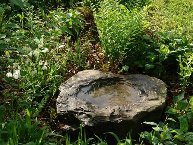 “Five years ago we got this local stone from a quarryman,” Rick Darke says. “I chiseled into it to create a water source for birds.”
