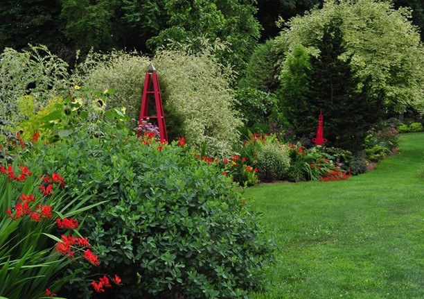 The perfect placement of two red sculptures, along with red-blooming plants, creates a visual rhythm that is pleasing to the eye. Photo by @pamdigging