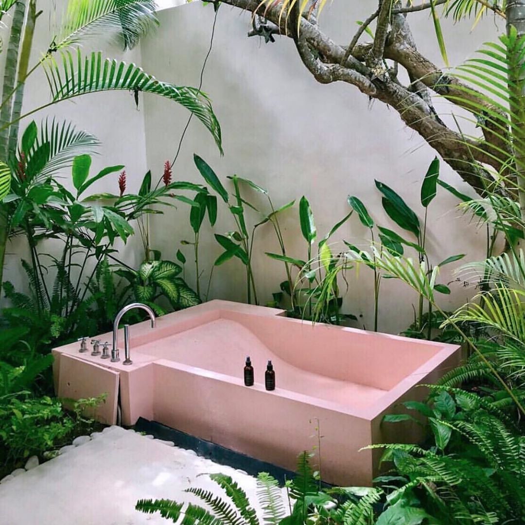 You know we like to bring the outdoors in, but did you know we also like to bring the indoors out?!? This situation from @biodara (via @ceremoniashop) is giving us all the vibes! Thanks for the tag! #jungalowinspo #jungalow #outdoortub #pinktub