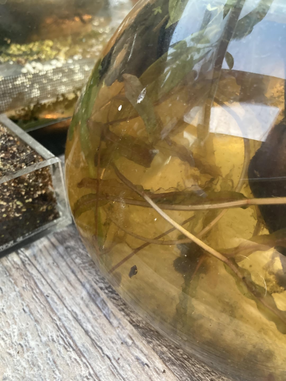 I live on a lake, so I’ve been picking some loose plants that float to the dock to put in the bowl. Started out as just a piece of wood with the circular plants and the tall plants (idk plant names yet) attached 🙂 now there are so many snails and even a worm hiding in there!