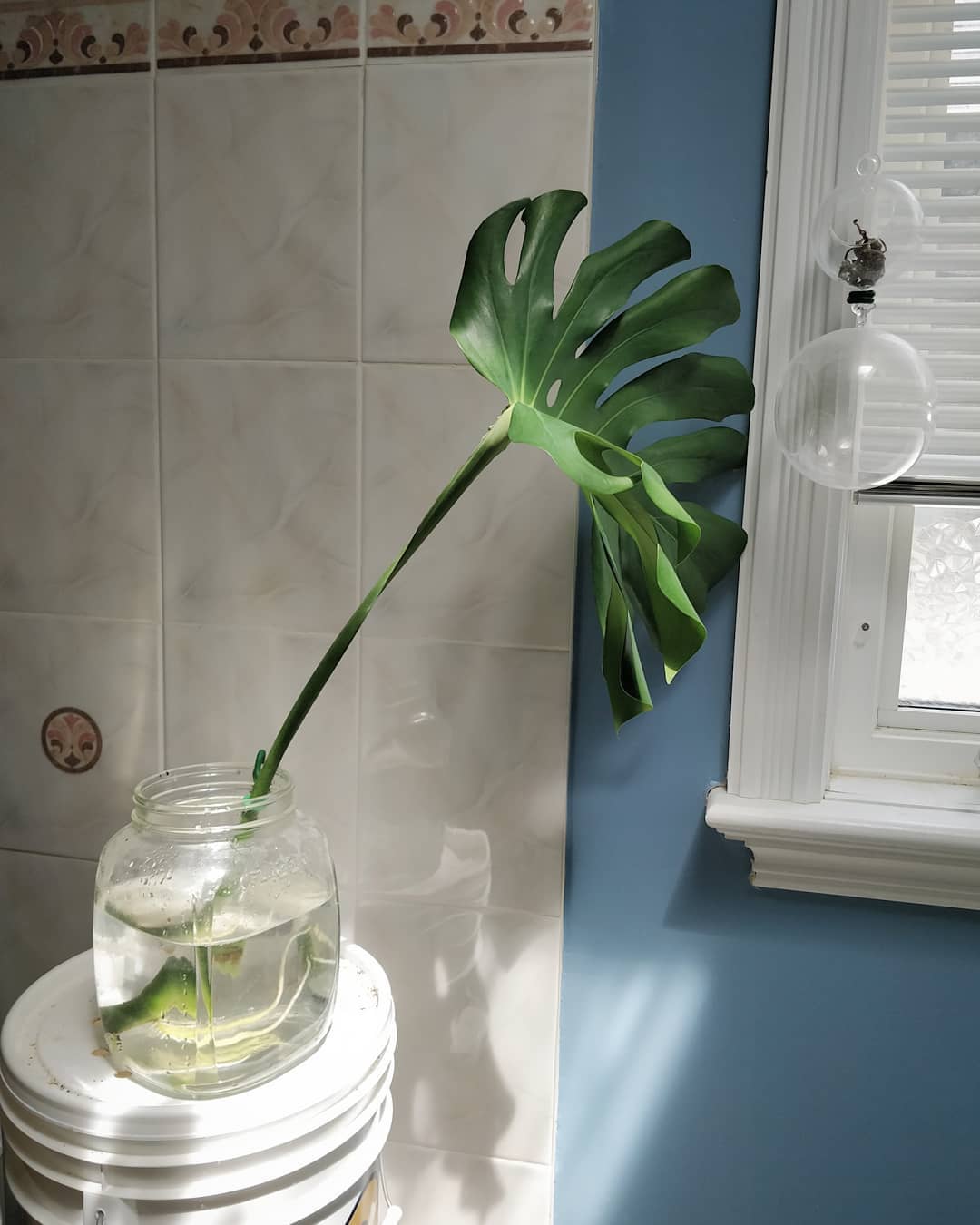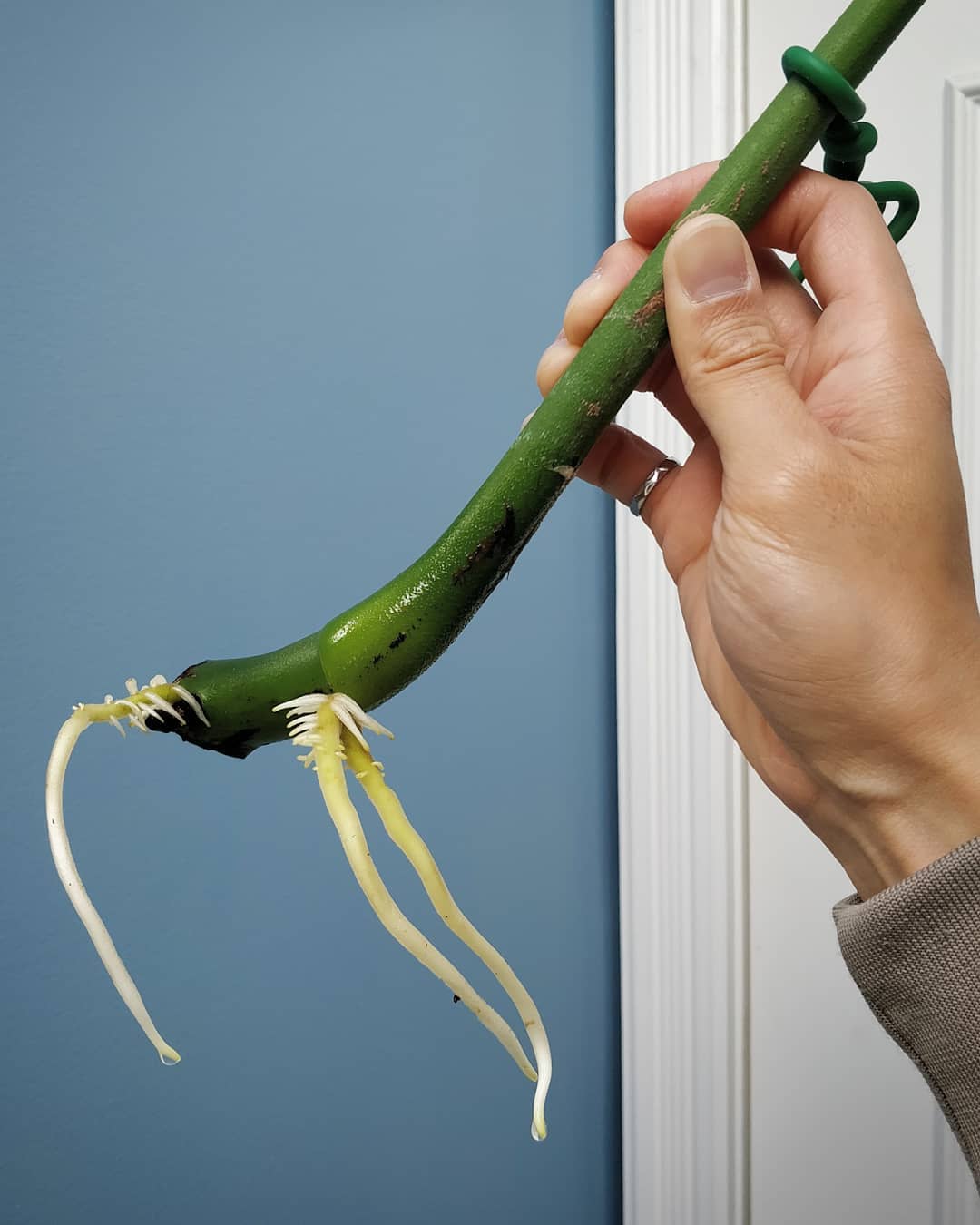 Rooted! 2️⃣ Look closely: roots emerge from the *node*, which is also where a new vine will grow. If you got a leaf with only the stalk (technical term: petiole) but no piece of the main vine (that contains nodes), then it will not grow a new vine. 3️⃣ The propagation setup: a big jar with soft wire ties to prop up the cutting.