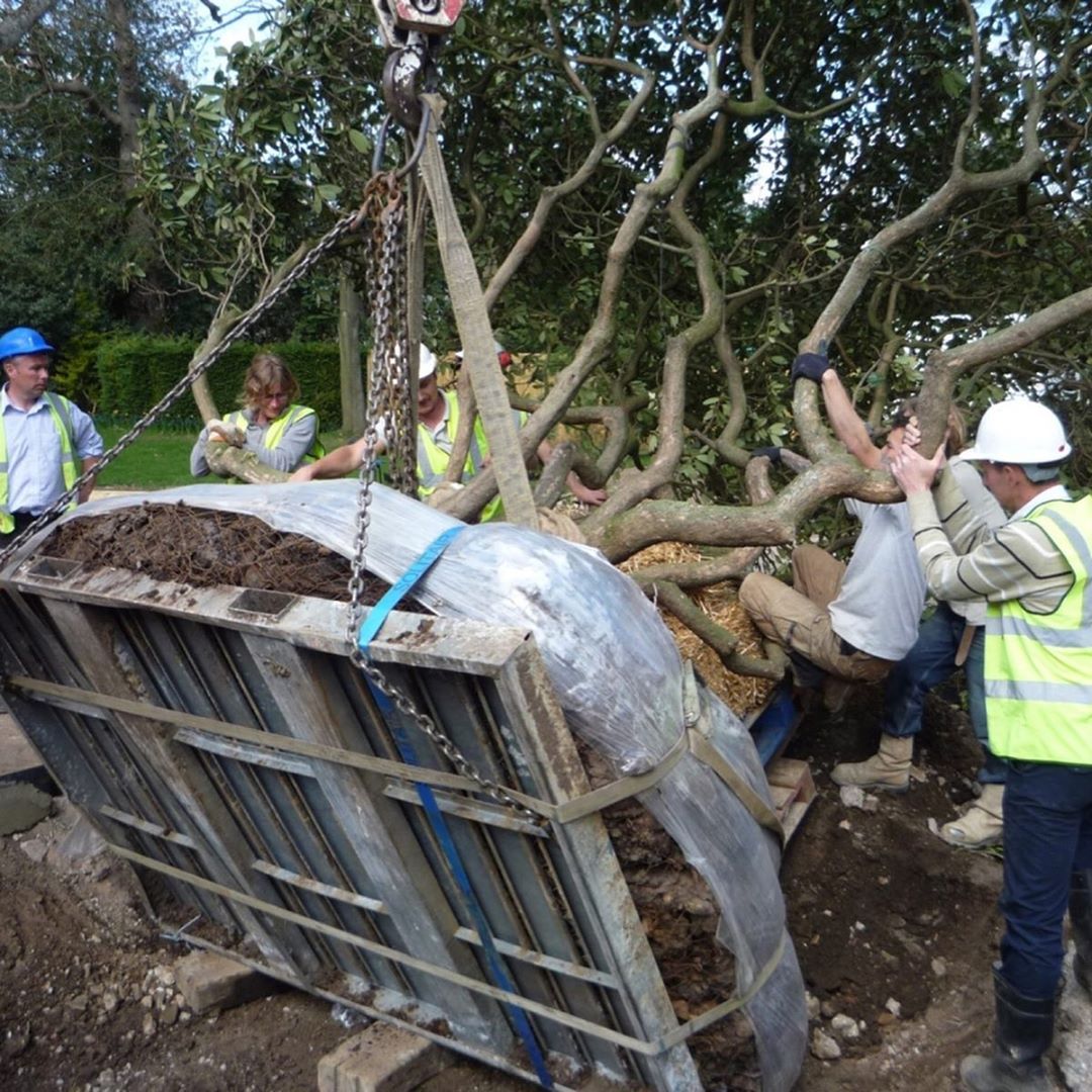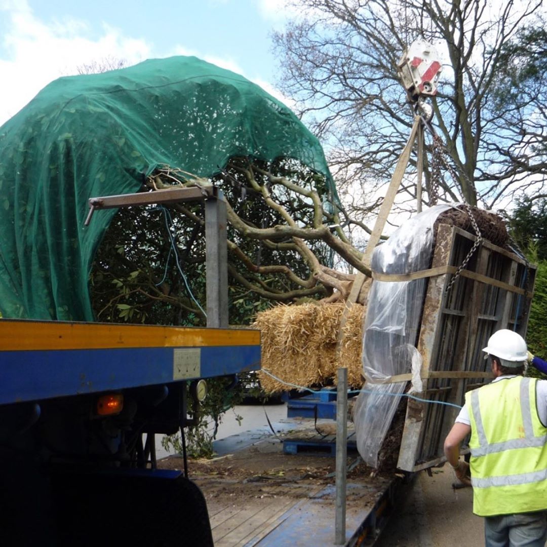 I thought you’d like to see the large Rhododendron shrub from my earlier post being planted. It had its own extra wide lorry over from Holland… totally blocked the road and then needed an enormous crane to get it over the gate that it was too big to be driven through. Six people and the crane were needed to get it into position and to have its best side forward. Well worth the effort I think and I hope you agree!