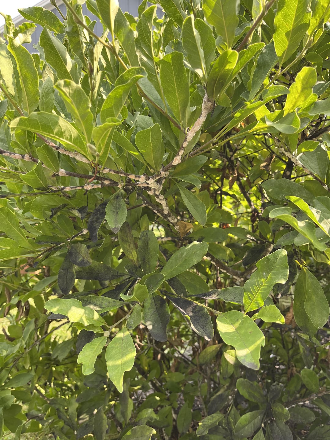 Just moved into a house in southern Ohio and this bush in the back yard is COVERED in this white mold(?). It comes off powdery, but it’s attracting Baldfaced Hornets and wasps like crazy.