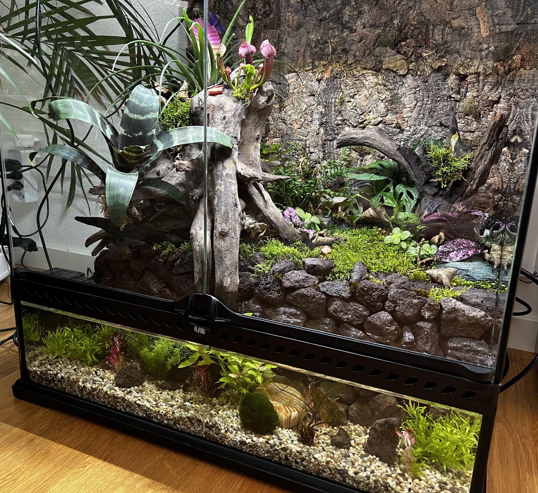 I would say a successful first try on building a paludarium. Currently only isopods and springtails, animals will come shortly. There is one thing that bothers me: the substrate sits on leca, with a layer of weed fleece and a layer of charcoal, approx. 3 cm above the water line and after only one misting (automatic misting system, 20 seconds), it became extremely soggy and is proper wet for 4 days now. As far as I understand the leca pulls up the moisture, which is probably the culprit, but the question is: is this normal, or do I have to worry? (I mean paludarium does come from the word swamp, so maybe I’m just overthinking it) Thanks for any help in advance
