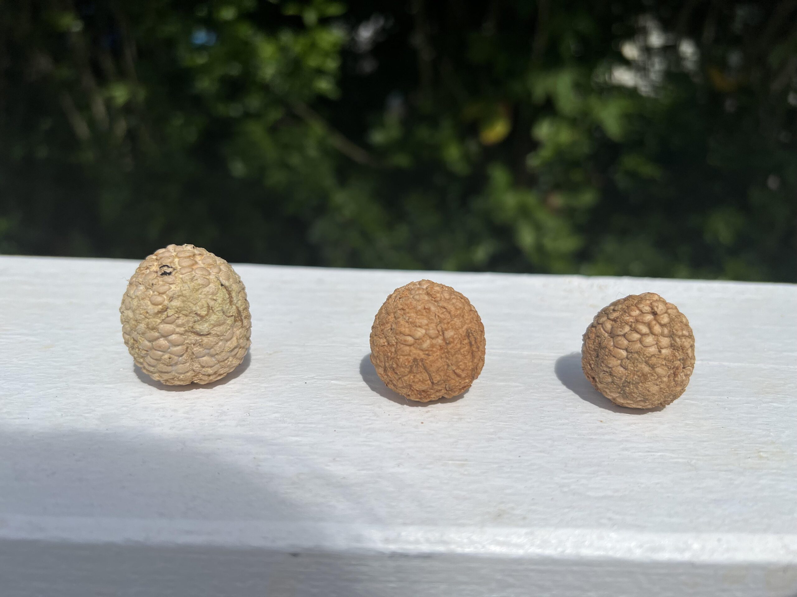 Can anyone determine what kind of seeds these are? They keep randomly appearing on my deck in the morning. One on the left is the newest, the other two are a bit older and have shrunken as they lost moisture.