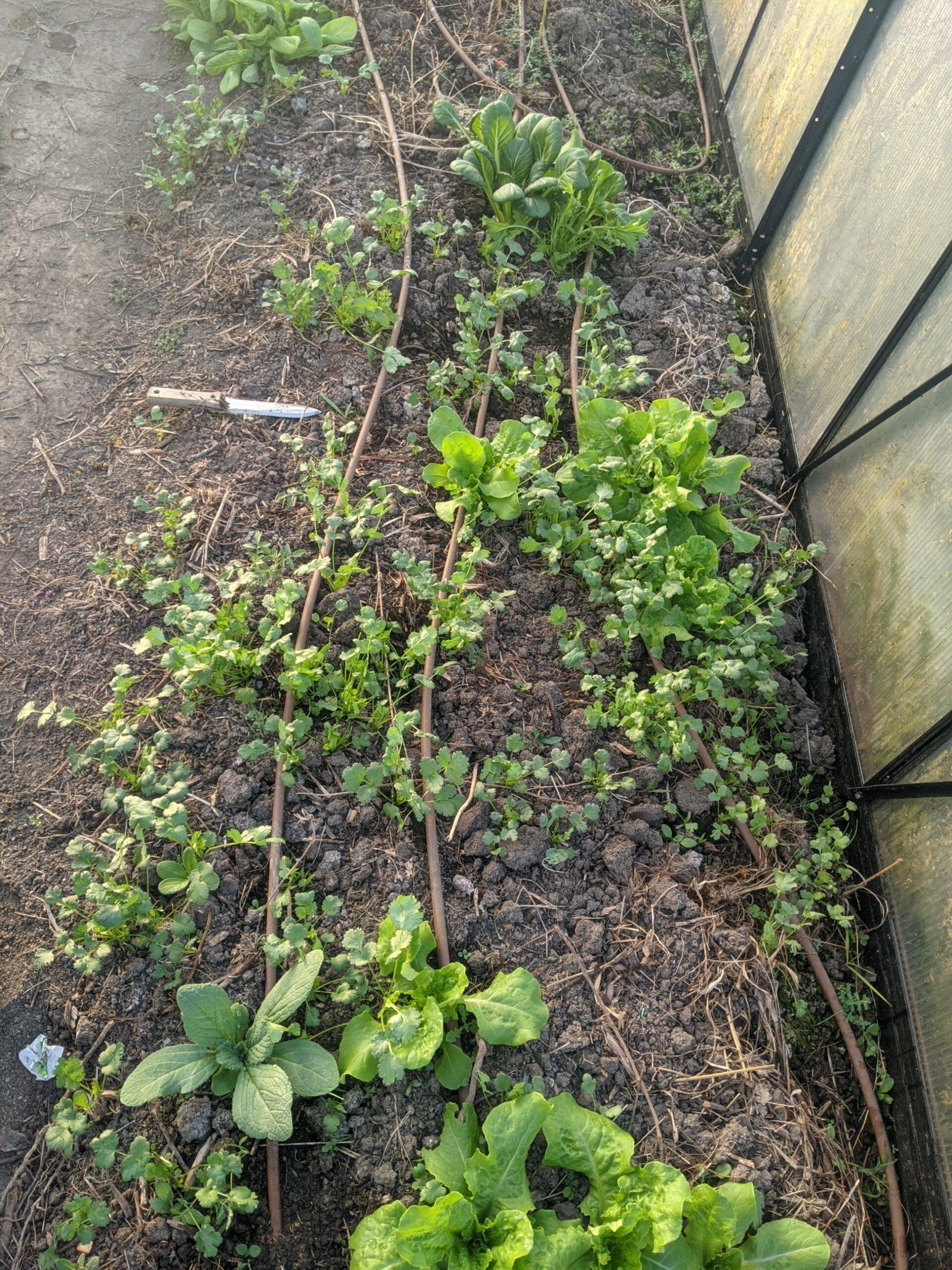 In my greenhouse I often have a few plants left over after the main crop has been harvested, I let these ones flower and go to seed. This year I dug over the beds with some compost and fertiliser, watered but didn’t sow anything. Now I have good crops of coriander, lettuce, tomatoes, Tat soi, Mizuna, even a few chives. There is some Borage and Queen Anne’s lace (Ammi majus) that came in with the compost. It is winter here in Australia but the heat from the greenhouse gets things germinating early, and protects from frost.
