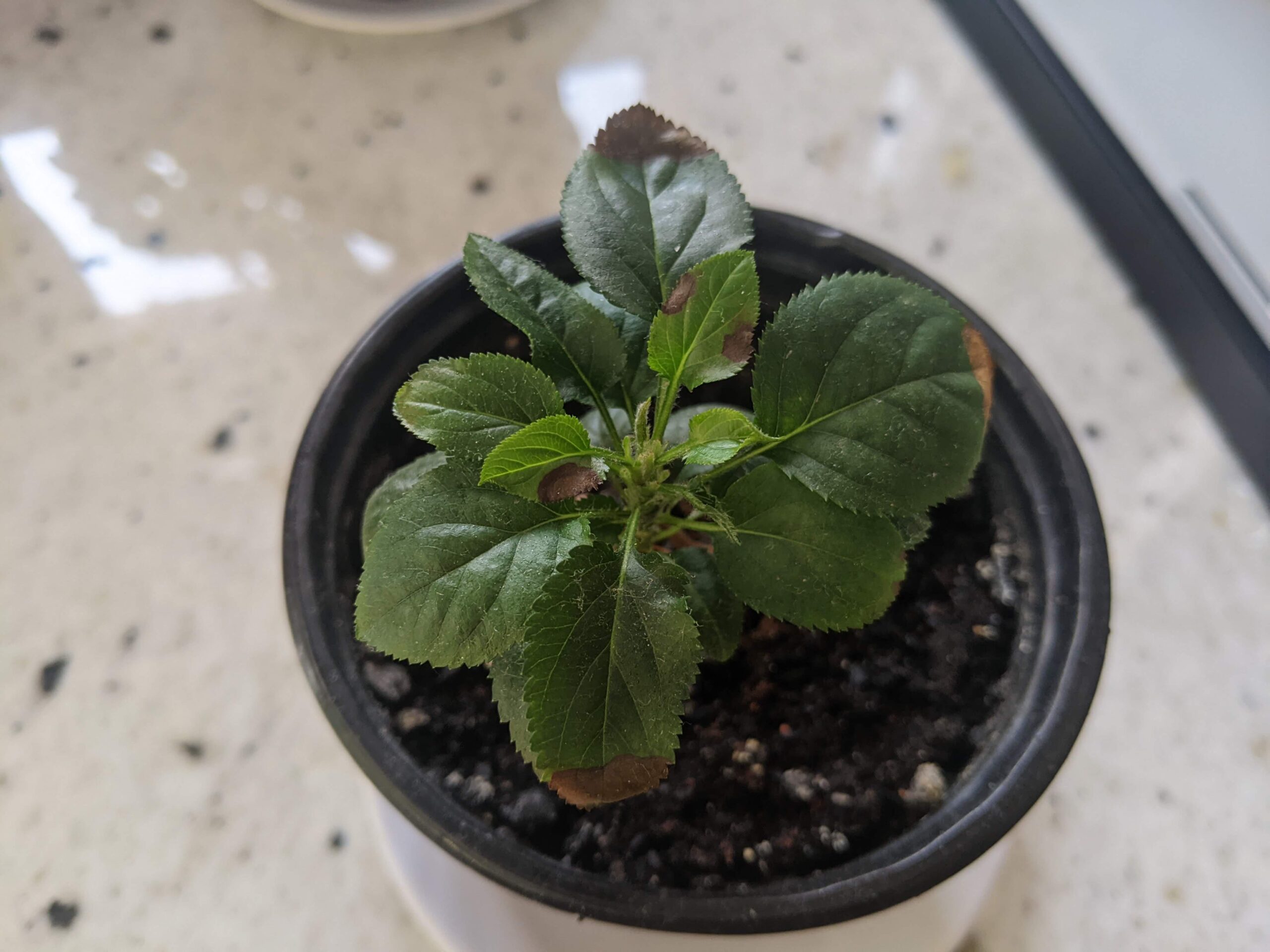 I have a second pot with a similarly sized seedling from the same apple (Fuji I believe) who is free of any spots at all. They both stay in the kitchen by the window facing west receiving most direct sun in the afternoon. I’ve been watering them once every other day or as the soil becomes dry. Let me know if you would like more info! I’m no expert so any extra insight would be really appreciated.