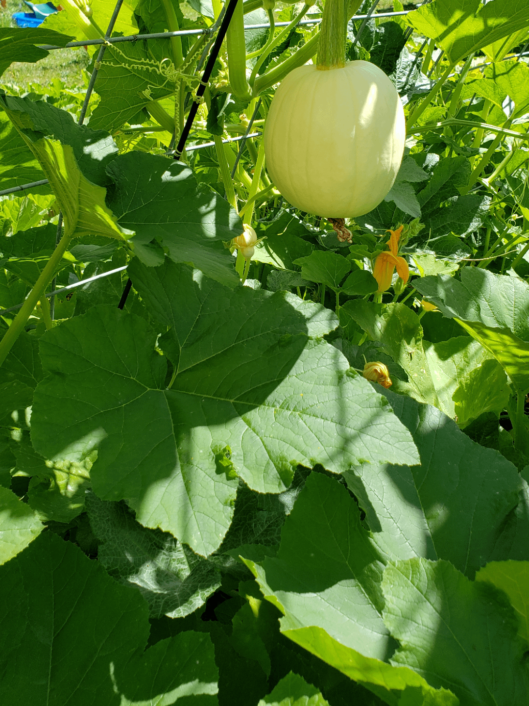 Pumpkin of some variety, probably white since that one hasn’t gotten any color and orange ones usually do by now.