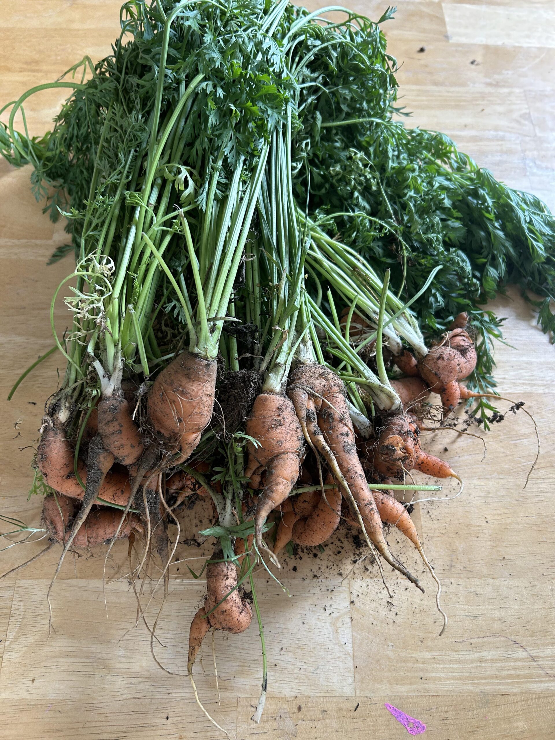Carrots are harder to grow than you might expect, and you are **so close.** You are really almost there for perfect carrots. You had good germination, which is the hardest part, as carrot seeds take 30 days to germinate. You have to keep them evenly moist throughout this entire time. Youβll feel like a crazy person watering this patch of soil for a month. You had just the right amount of nitrogen in your soil, those tops are bushy (ππ»), but not crazy huge (excess N in the soil). The twisted short roots means your soil is too compact, *thatβs what you need to fix.* Aerate it as deep as you can (like with a broad fork) and mix in some compost. Or sand, if you want to make that a dedicated carrot growing area with sand. Once you have the soil very loose and friable, you will get longer roots. Youβve almost got it, next year is YOUR CARROT YEAR.