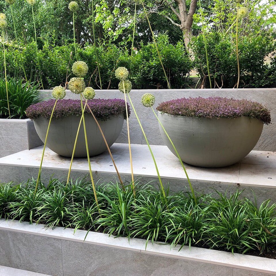 We used a pair of Urbis Design bowls to act as a focal point on this stepped terrace. The bowls are planted with Thymus coccineus, selected for both the flowers and scent, with each bowl subtly uplift at nighttime #gardendesign #landscapedesign #contemporarygarden #garden #landscape #luxury #urbisdesign #dulwich #jamesleedesign