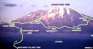 The guys entered via the Machame gate on Sunday morning (see map) and climbed over 18k to their first campsite. (Kate has now spent her first EVER couple of nights in a tent! No frills here; a sleeping bag; a roll mat and her jacket for a pillow)