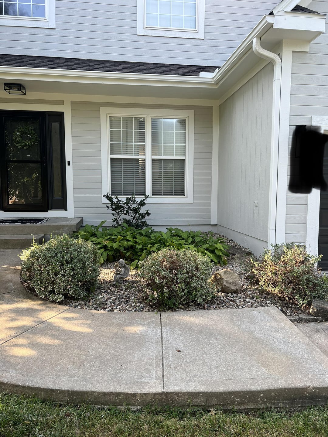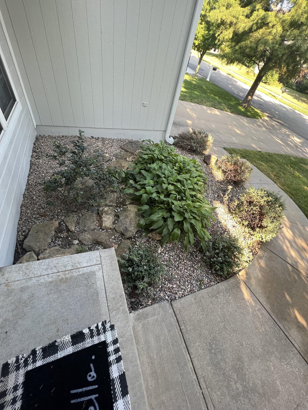 So I am looking to redo my landscaping by my front door but have no real clue what to do. My house faces North and parts of it get lots more sun than others (see the existing bushes how the ones in the back don’t grow). I don’t mind the Hostas but nothing else looks good. I am just lost on this stuff any help would be greatly appreciated.