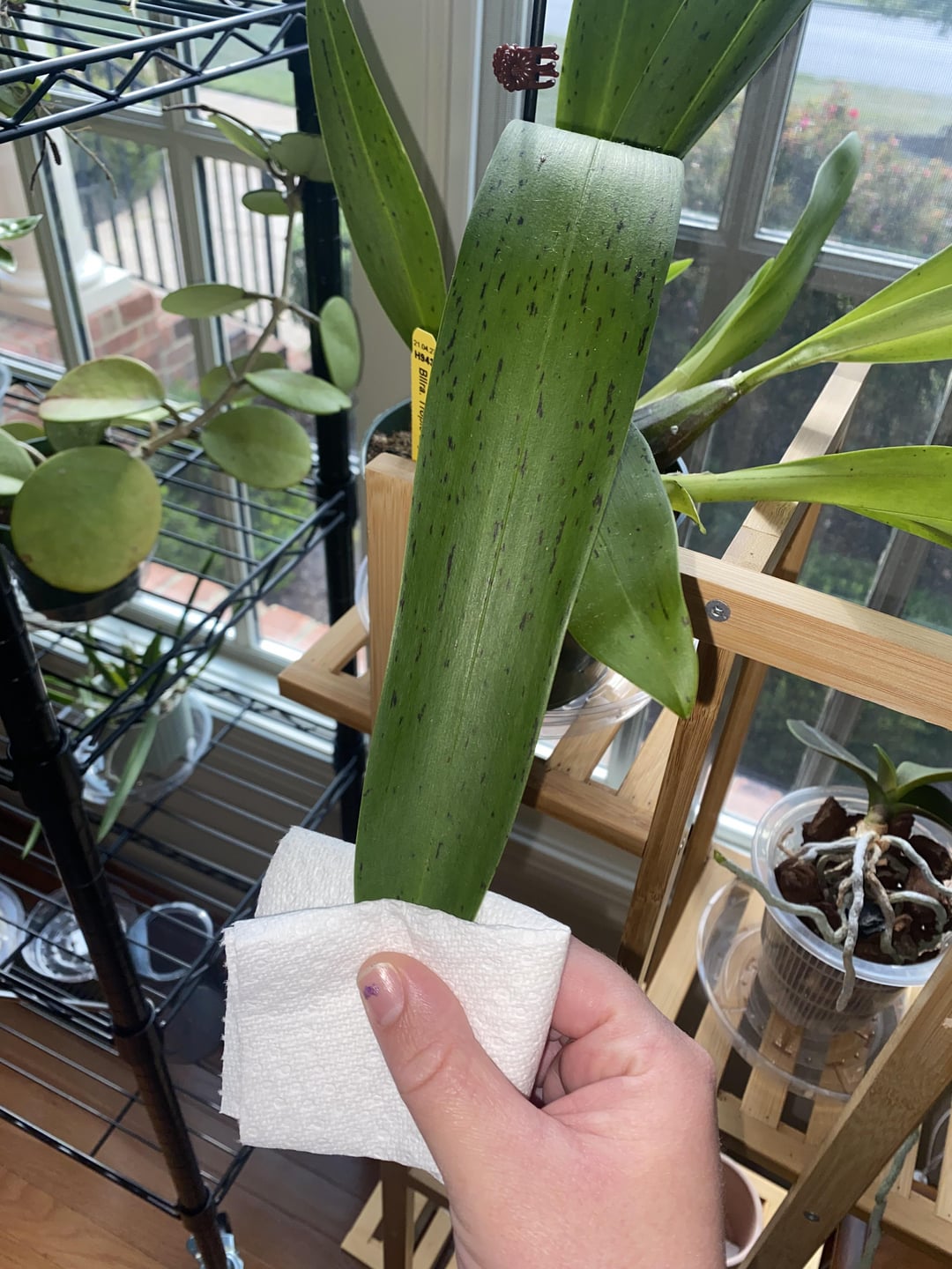 This plant lives in a SE facing windowsill and exposed to very bright indirect light for a good portion of the day; lives in about 45-50% humidity, fairly dry. I omly water when she’s bone dry and her psuedobulbs start to shrivel a bit; I don’t think any my of plants get great air circulation.