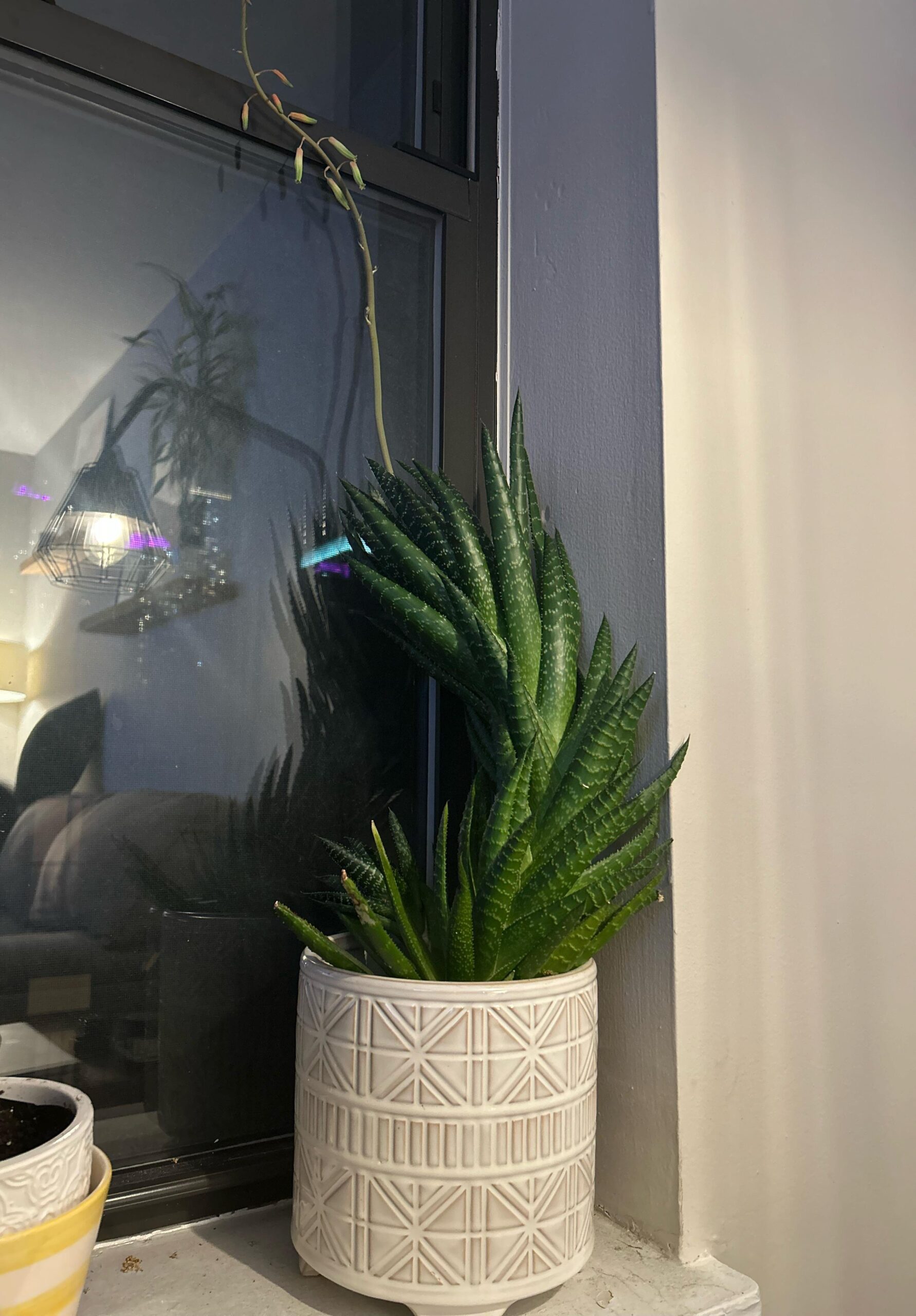 It looks like a Haworthia to me, and the alien growing out the top is a flower bud 😁