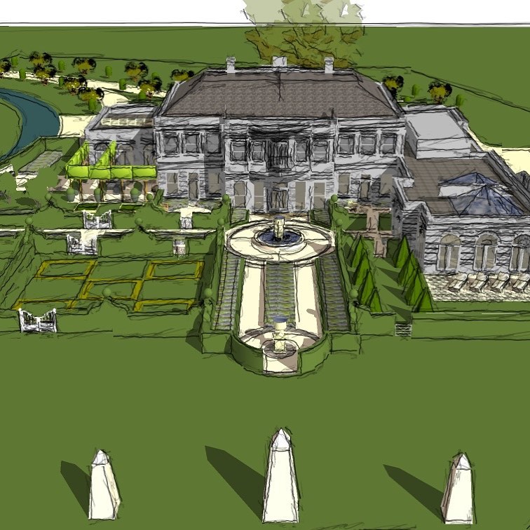 Spot the difference from the design sketch we posted yesterday. This was a more traditional ‘garden room’ option with fountains, topiary and a long herbaceous border. Which do you prefer?