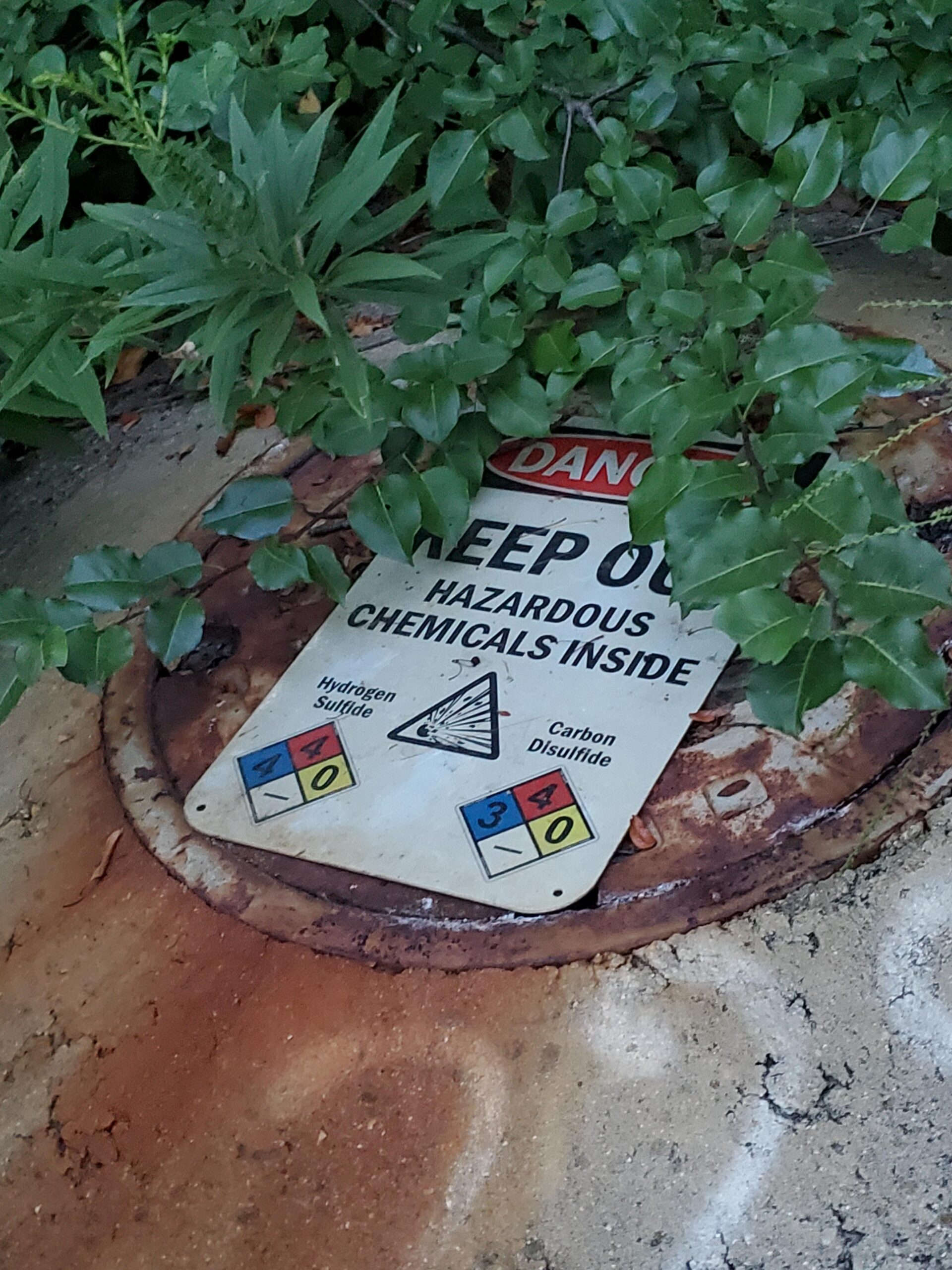 Hydrogen sulfide is a common byproduct of sewage and septic conditions. No clue about the carbon disulfide. The lid and cement ring look similar to a sewage manhole?