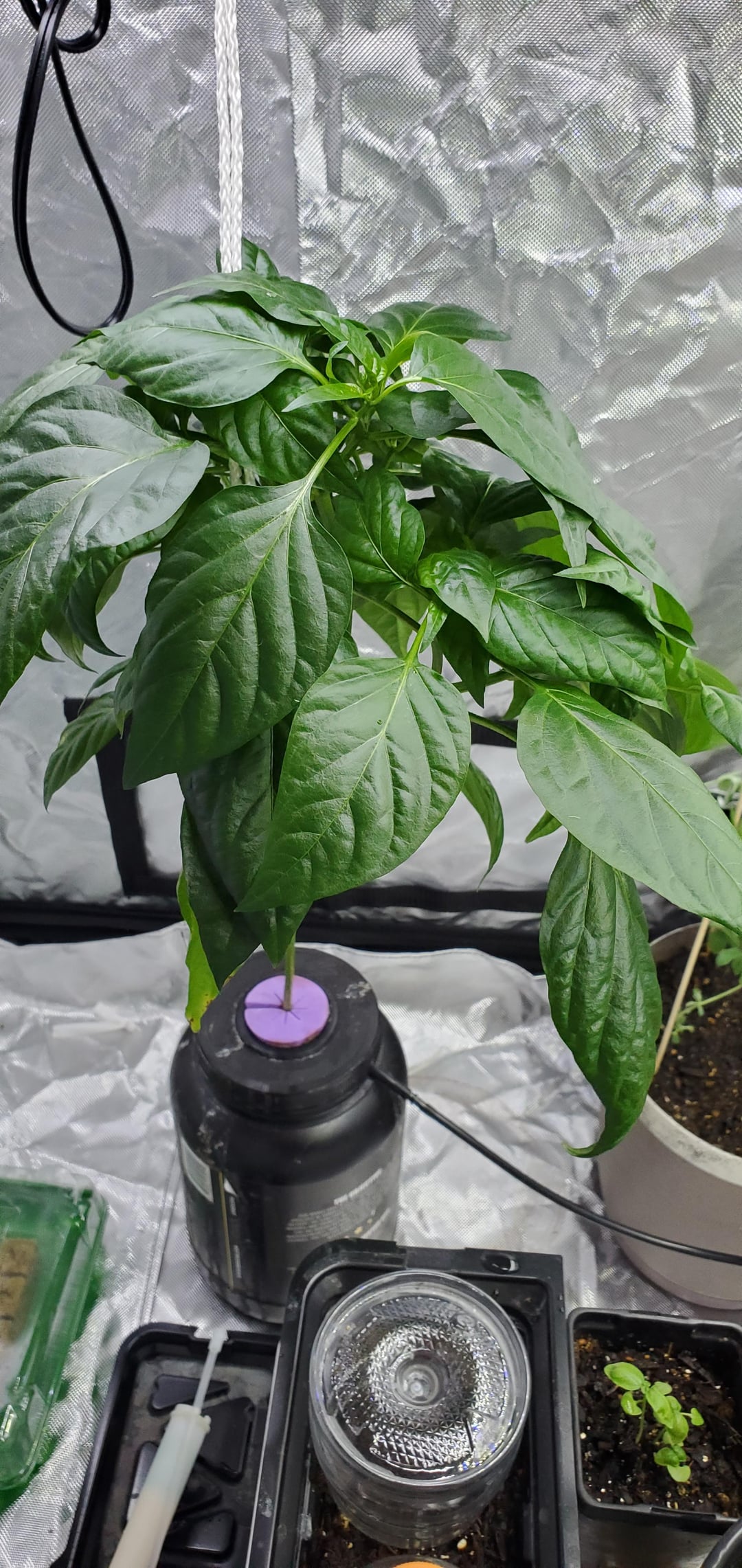 Been working on these plants for over a month but the big pepper plant DWC is not wanting to bloom or make any peppers. Super green and happy but that’s it 😕. As for my butter crunch in the small DWC, it grows great for a small stent then dies back. I have the foam piece trimmed to allow the stems to grow fine but they seem very weak and thin. I’ve noticed the roots don’t want to spread out which is odd.