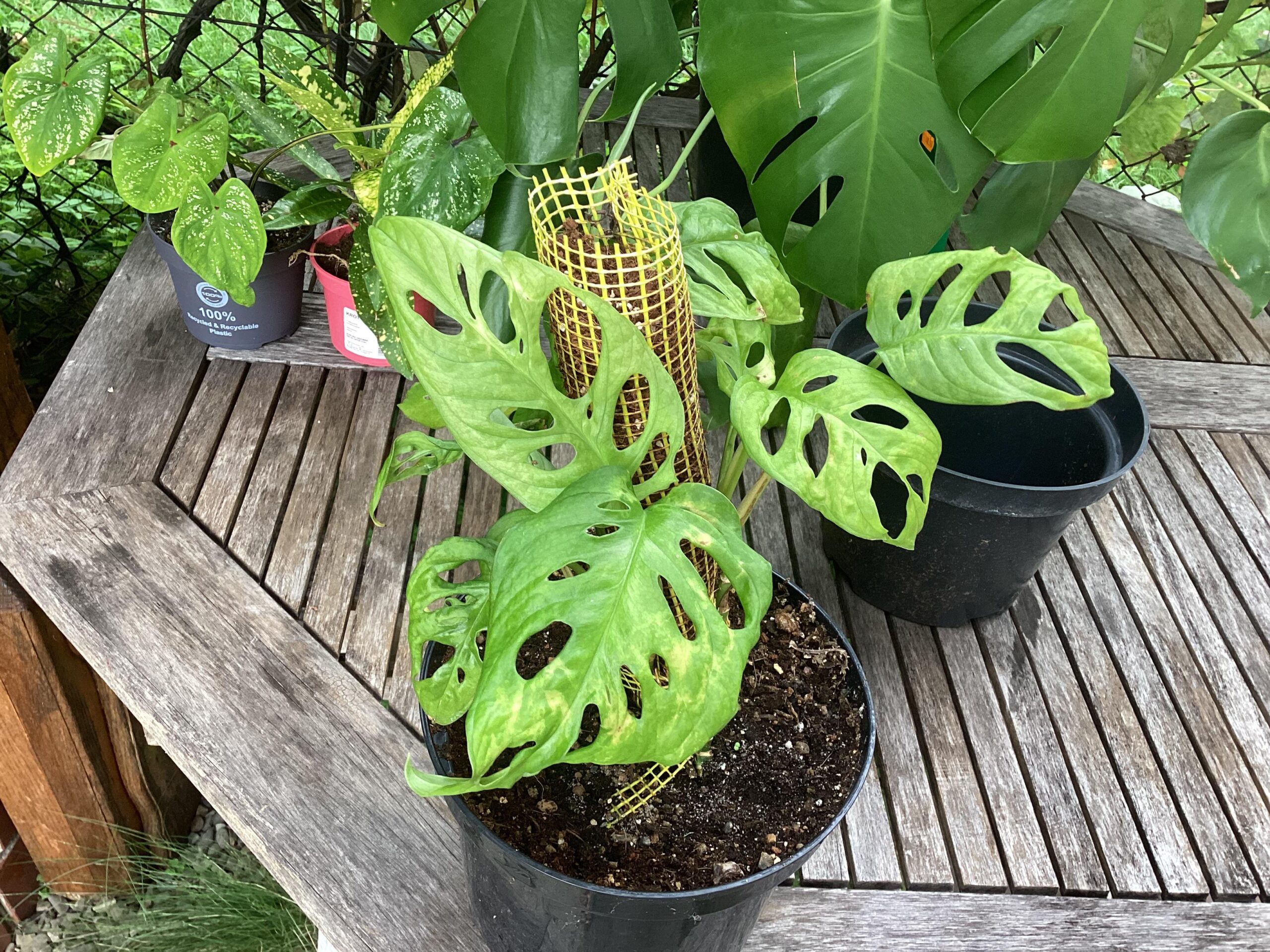 In Jan I got my first Adansonii for free because it was just vines (like 4 ft long vines) and maybe 5-8 leaves that mostly died in transit. She was sad for a very long time, and back in April I put her outside, where she finally put out a few new very tiny leaves or leaves that were white/translucent in some areas.