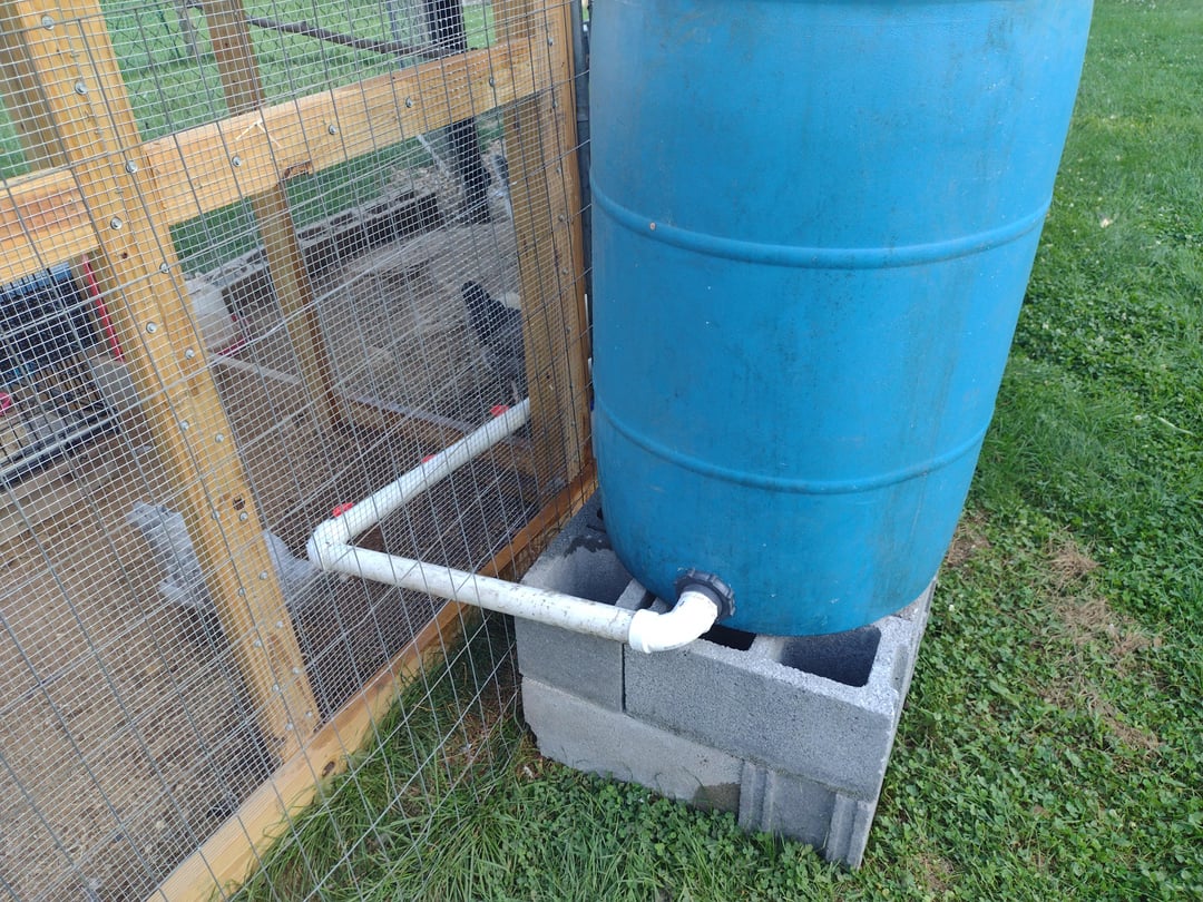 We set up something similar. Ended up having nasties in the barrel, couldn’t figure out exactly what it was, so we abandoned the rainwater collection part of it. But it’s a lot easier to partially fill the barrel from the hose every few days than to run buckets daily. The cups are really nice and relatively affordable from Amazon.