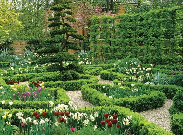 What caught your eye first – the espalier of hornbeams, the boxwood hedges, the flowers, or the 100-year-old yew?