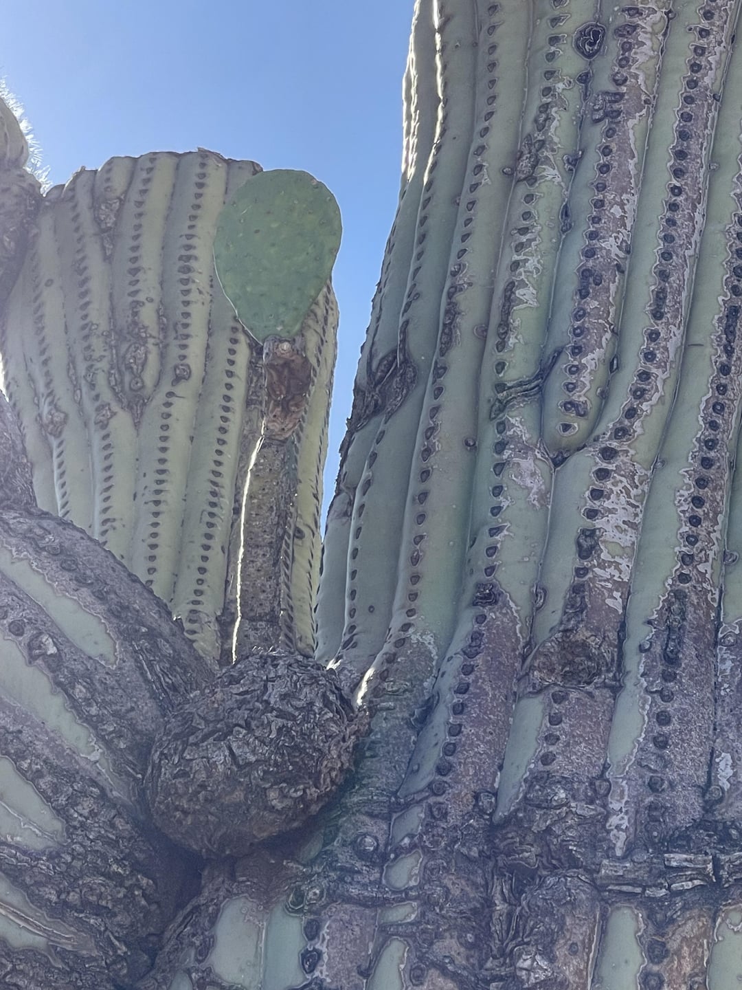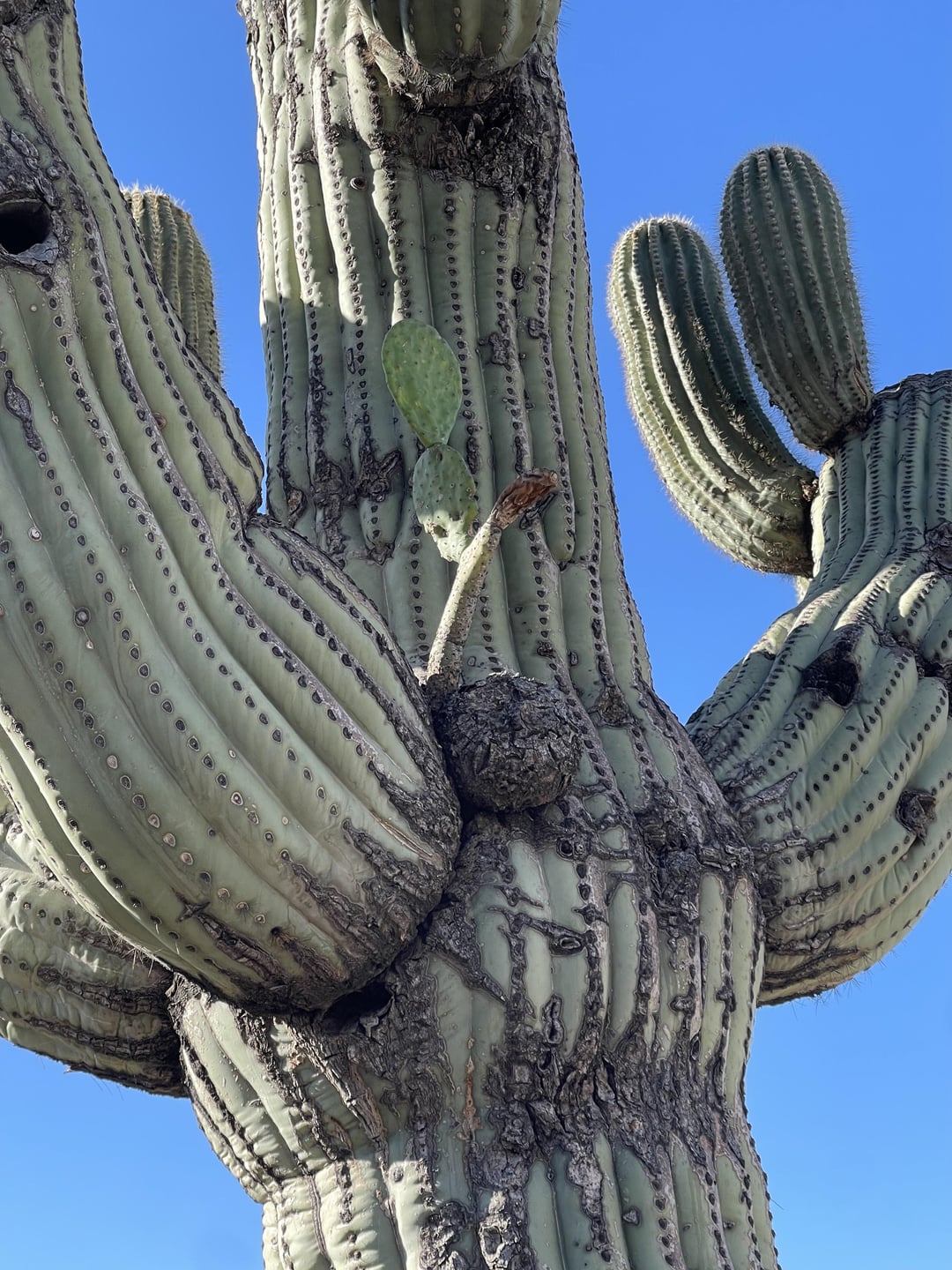 The pancake cactus has been there for years. Thought it was put there as a joke but it has been growing over the years. Guessing bird poop with prickly pear seeds landed on the saguaro and sprouted. Never seen this before and thought I’d share.