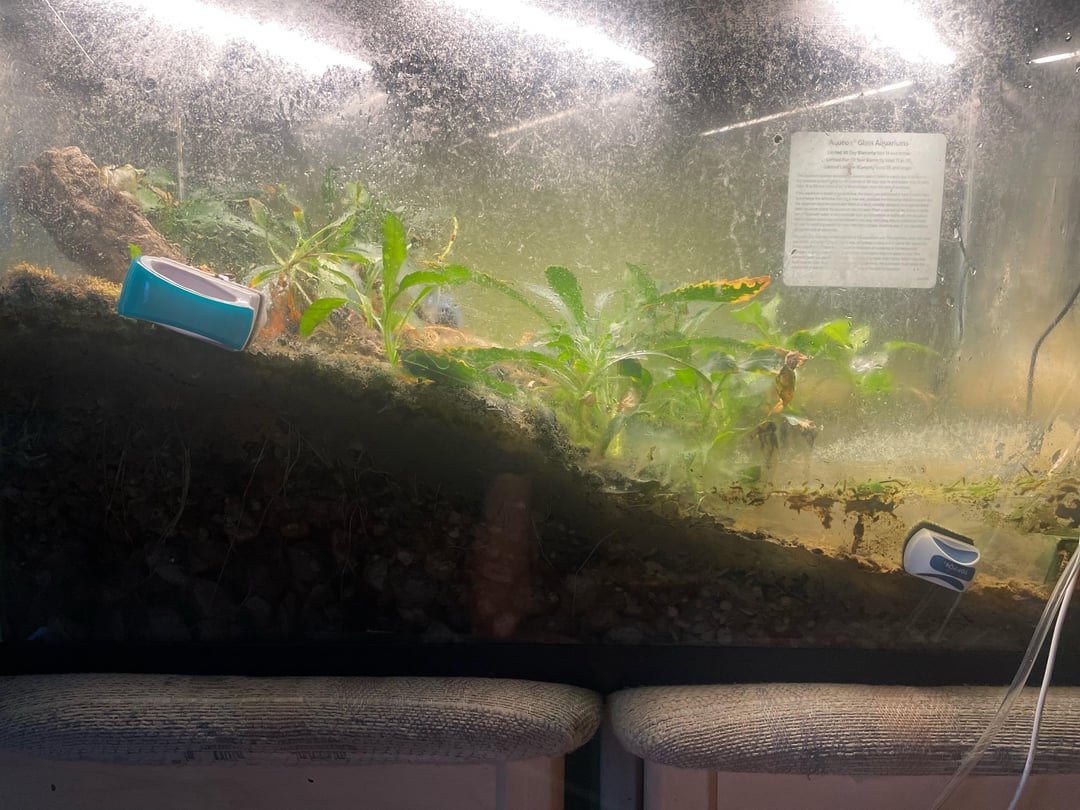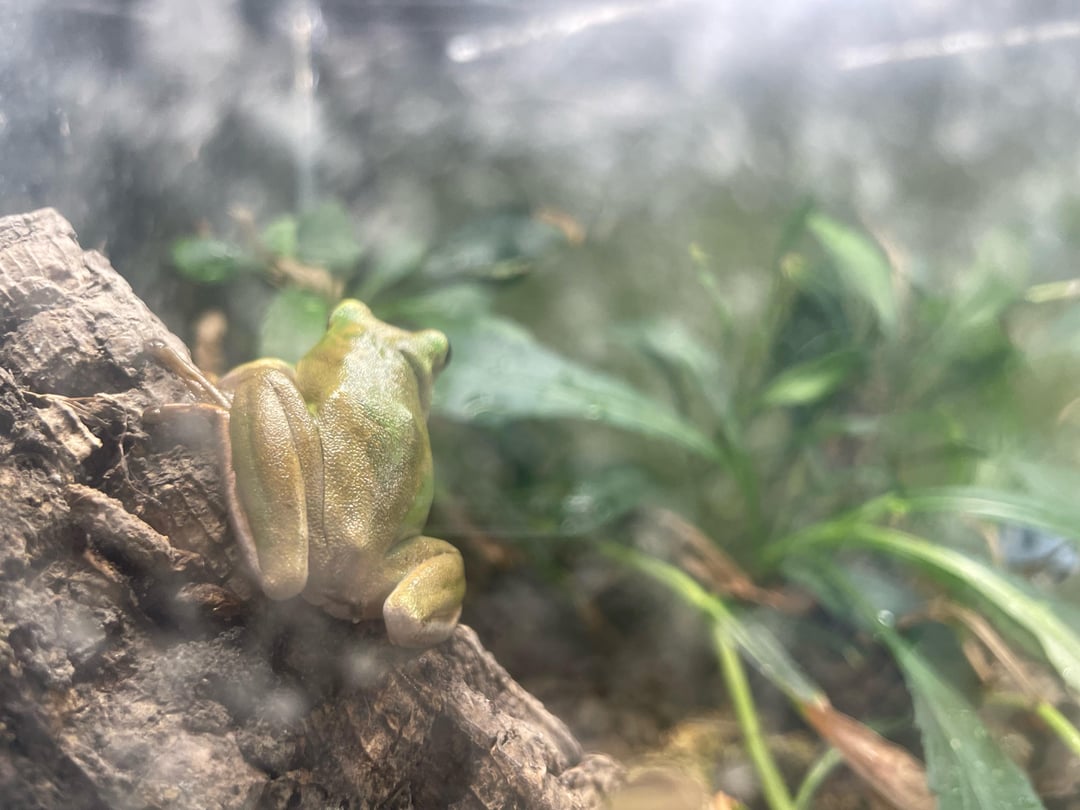 Yes I know the glass is dirty hard to clean with a frog who is always on the move. Also I know that tree frogs like vertical spaces unfortunately I can’t afford a big tall setup. But he/she likes the place and is as healthy as can be. The moisture levels and temps are all automatically controlled by both electronics and by how nature works (at night it gets colder and the humidity rises to 99% while during the day it gets warmer and the humidity falls to 50-60%. some times the little guy is sitting near the water other times the little dude is all the way up the glass. All I know is he/she is wonderful and the best family member I have ever gotten