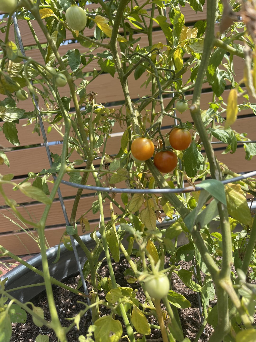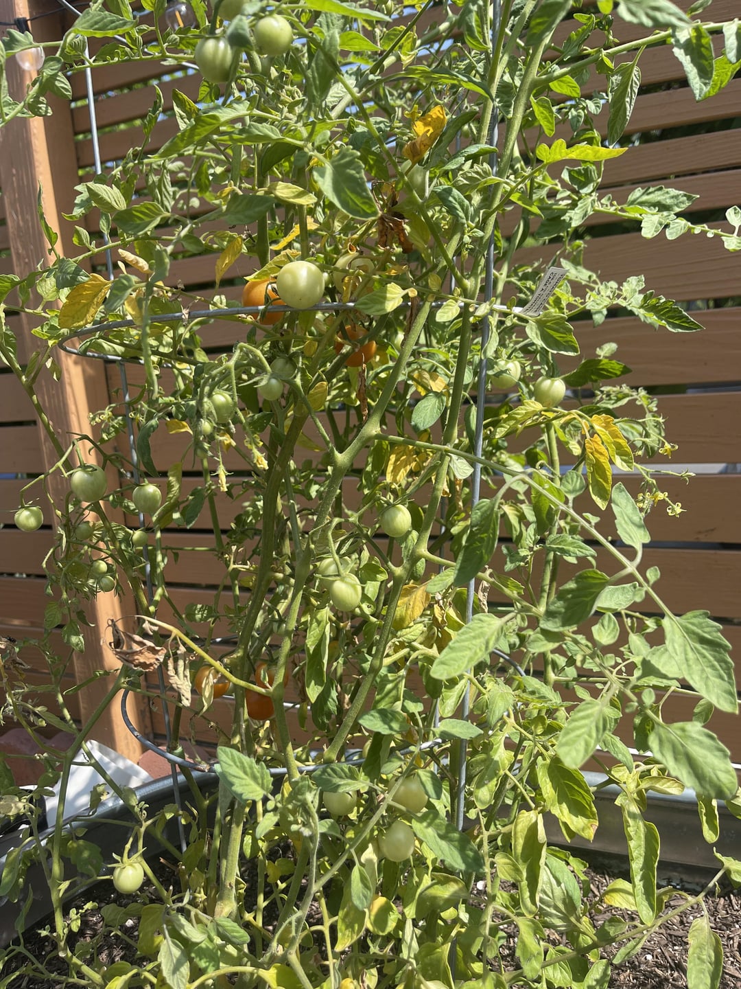 This plant was somehow already growing in this raised bed when we moved in (everything else in the bed was dead). I took it out, filled the bed with fresh soil, and repotted it when it was a lot smaller. It’s grown rapidly and was doing really well after initial shock until about a week and a half ago. Some leaves have started to yellow, some are even brown and crispy. Tomatoes are still ripening (very slowly) but some have remained green for some time. I water when the soil is dry, sometimes every day when it’s really hot. I know it looks like a mess- this is my first time growing tomatoes. I haven’t fertilized, as the guy at the garden center said the soil we bought contained enough fertilizer for the season. What can I do to help?