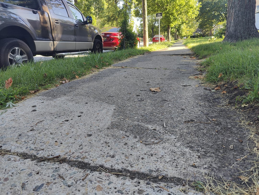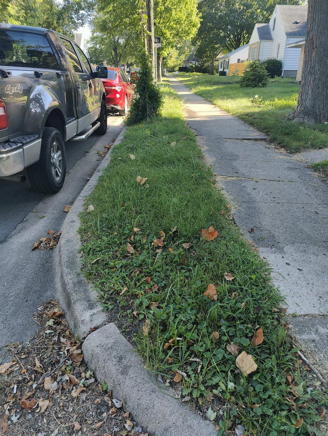I’m looking for advice on the ideal height for the dirt. I’m thinking I should remove a lot of the dirt from the tree lawn to bring it down level to the sidewalk. For the front yard, I’d use the same paving stones you see in the background as a border between the sidewalk and front yard to make up for the different in height.