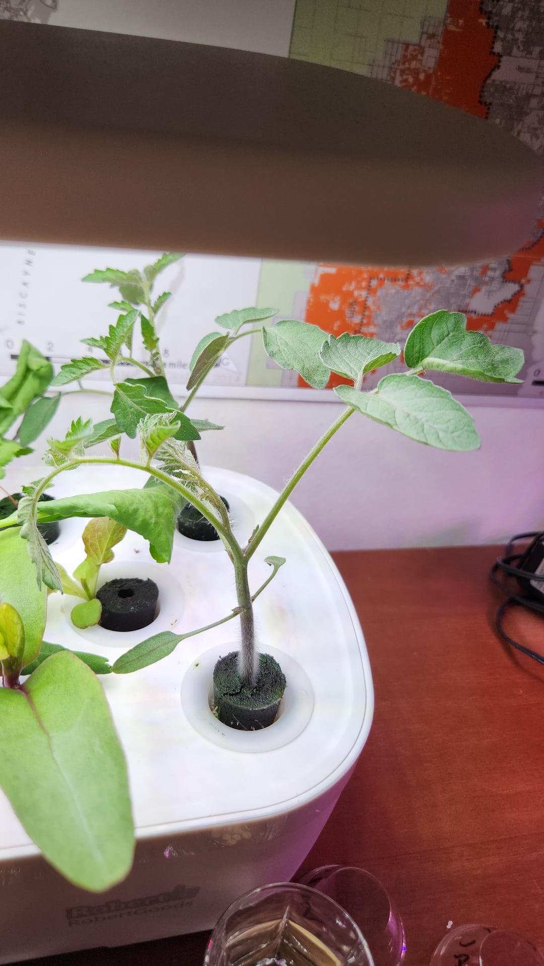 Hi everyone, kind of a novice here. I have a few aerogarden clones I’m growing a bunch of plants with, some to later transfer and some to keep in place, but one that notably hasn’t really grown is my Everglades Tomato. It’s been struggling a lot and has yellow spots, and it’s constantly shedding stems as you can see in the first photo. The second photo is of cherry tomato seeds I planted a week later which have already surpassed the Everglades tomato’s growth by far. Is there anything I can do to help it grow?