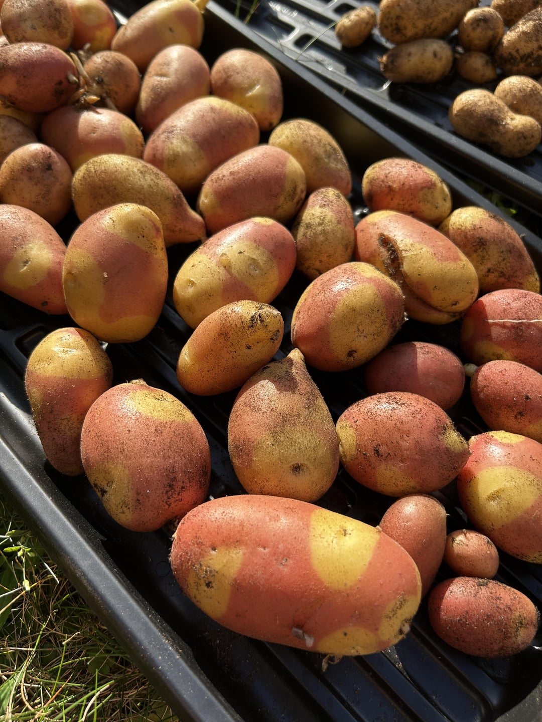 I put 3-5 seed potatoes in each bag and bags ranged from 10-20 gallon fabric bags. The smaller bags didn’t do great and we’re pretty root-bound though still productive. The random yellow grocery store potatoes were more an experiment and I won’t bother with them again!