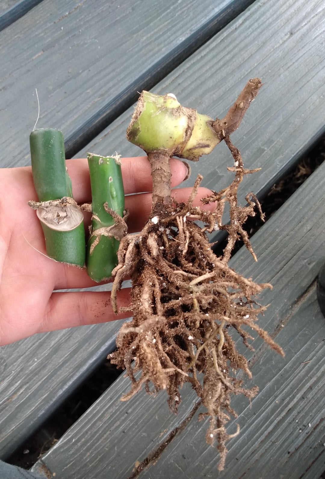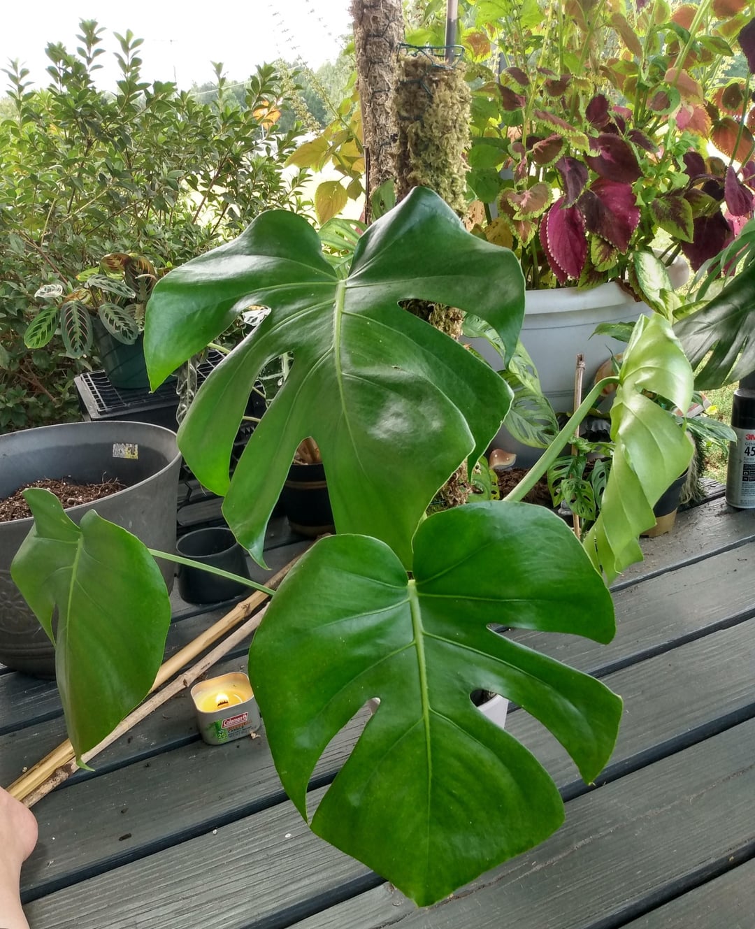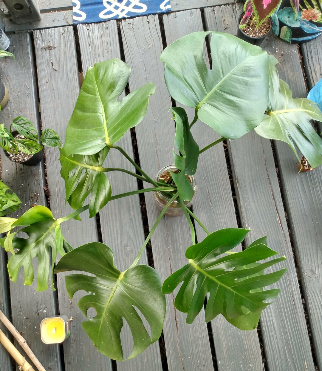 from two big vines on poles, I now have two new plants from top cuttings of both(four leaves each), nine single node cuttings with leaves, three nodes without leaves(one had roots and got potted, two with moss prop) and one base plant growing three babies. and my tiny baby has a new leaf 🥰