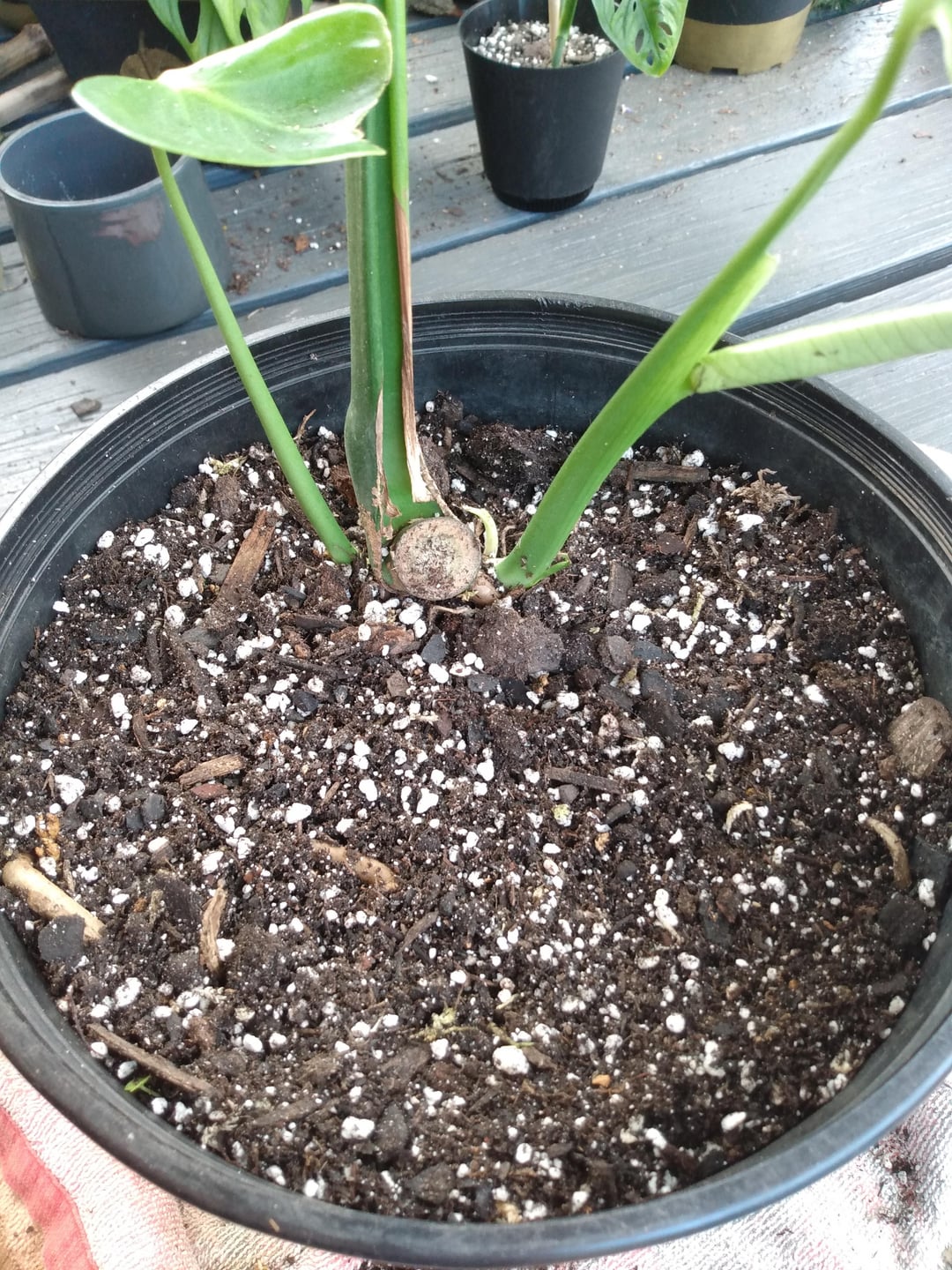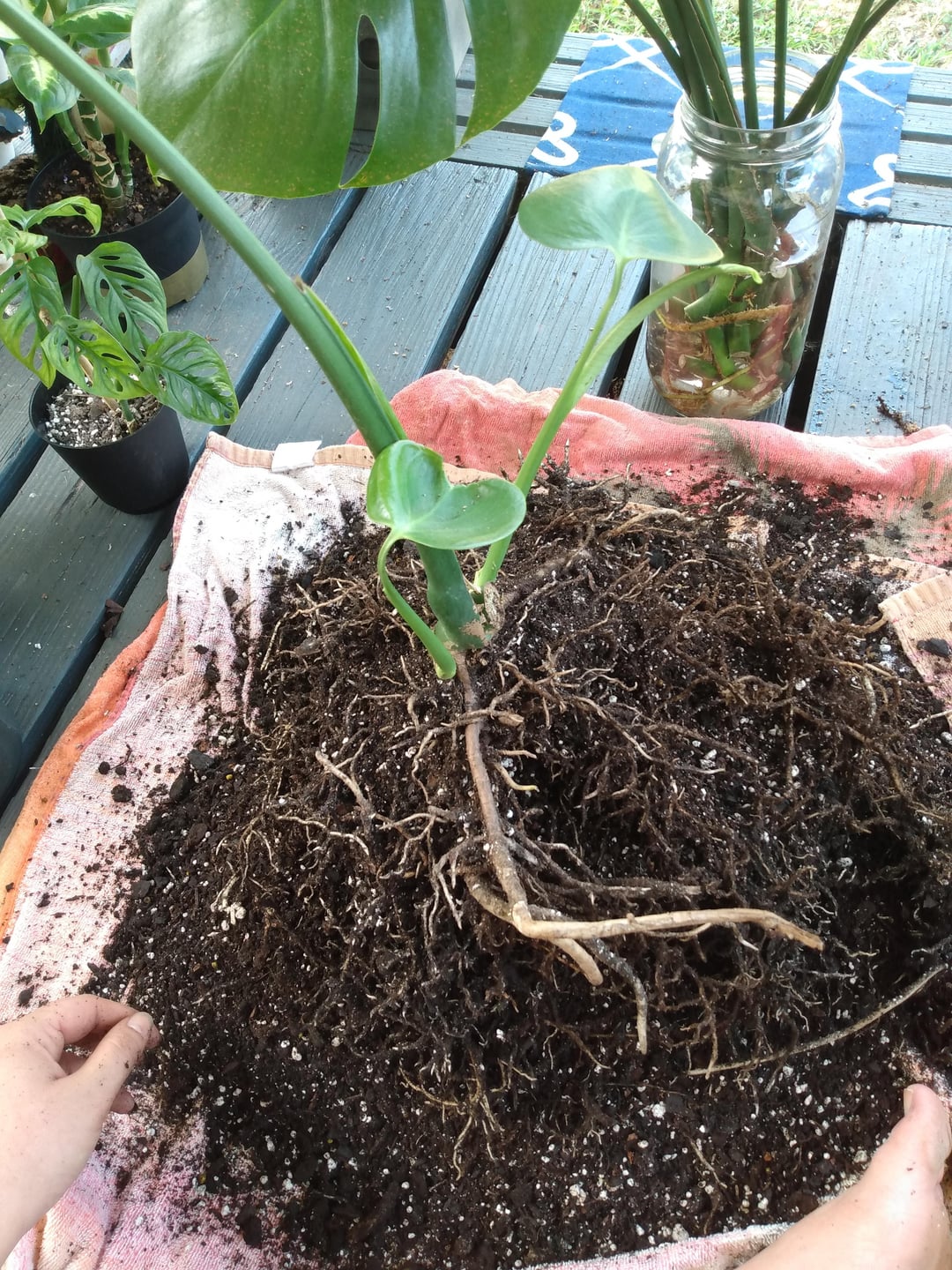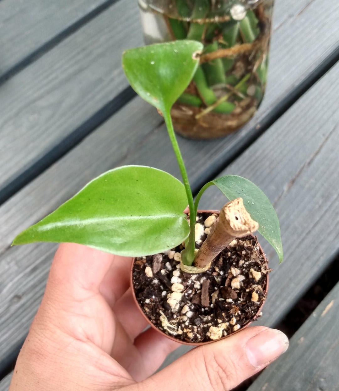 from two big vines on poles, I now have two new plants from top cuttings of both(four leaves each), nine single node cuttings with leaves, three nodes without leaves(one had roots and got potted, two with moss prop) and one base plant growing three babies. and my tiny baby has a new leaf 🥰