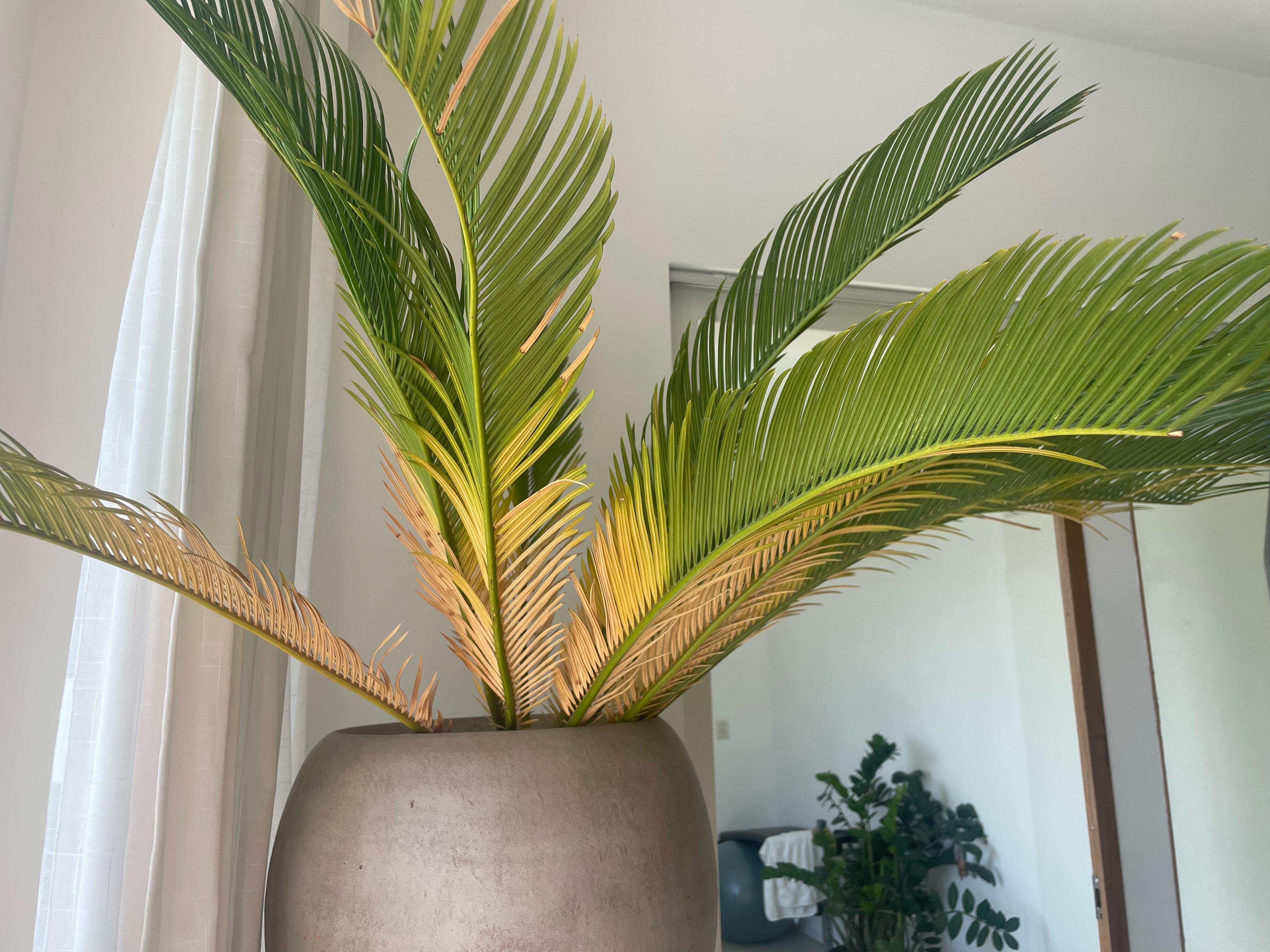 This looks like a sago palm. If it is the plant is relocating the nutrients in the leaves back to the plant and to any new growth. Don’t cut them off until they are completely dead. Sagos need a lot of light and don’t react particularly well to over watering.