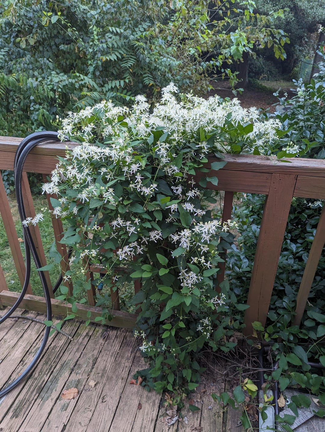 [Clematis terniflora](https://plants.ces.ncsu.edu/plants/clematis-terniflora/). It’s fairly aggressive and invasive.