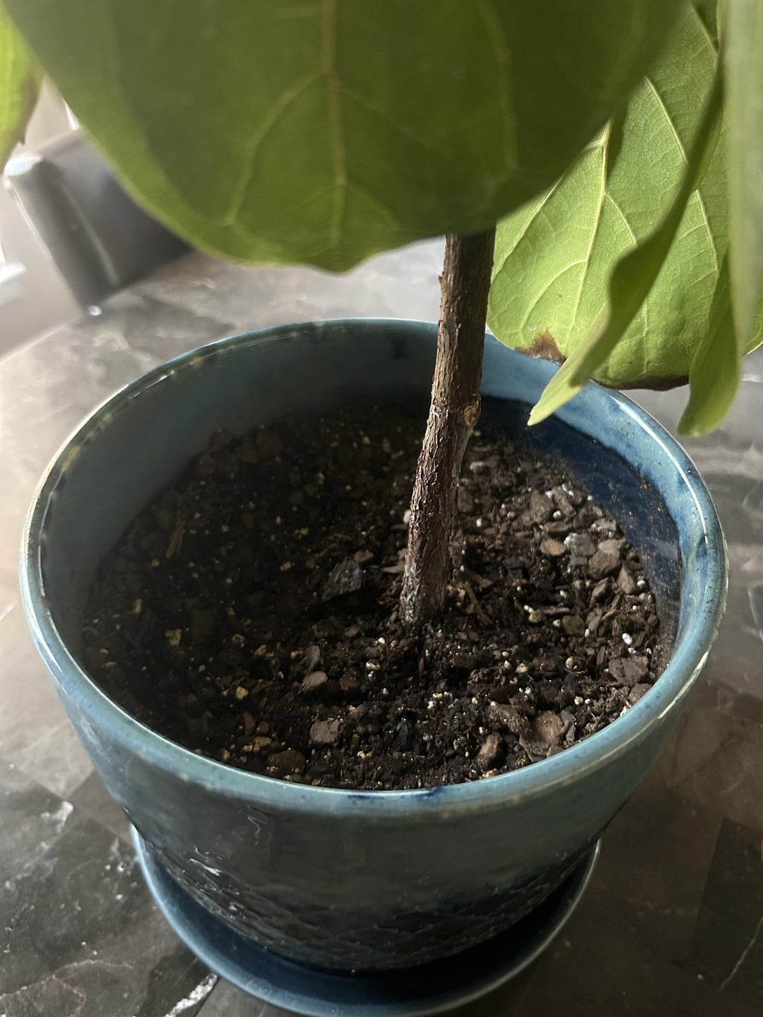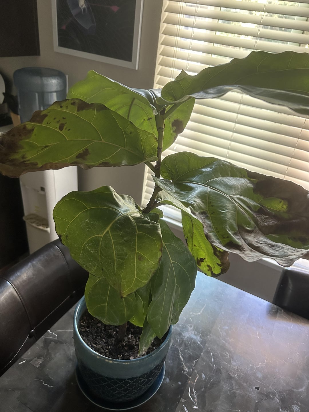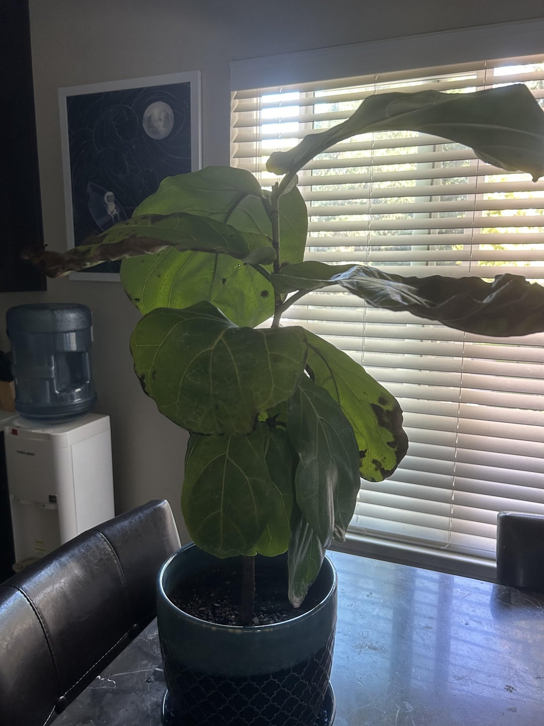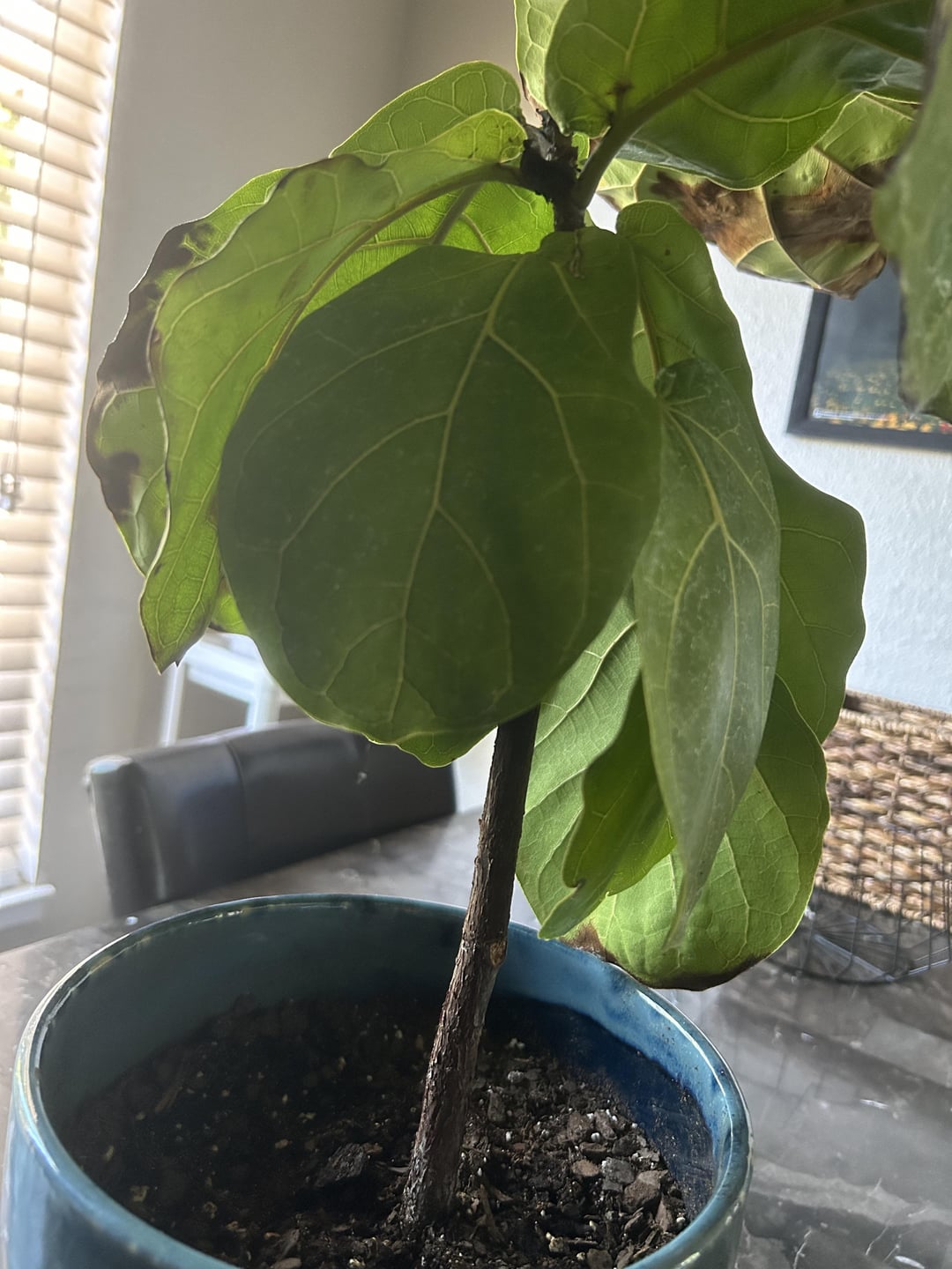 Here is my fiddle leaf fig in my balcony that’s east facing. Thats how much it needs light—morning sun & bright light the rest of the day—at least 6 to 8 hours. The more, the better. The soil is also dry and it’s thriving. https://imgur.com/gallery/xzhmg0Z