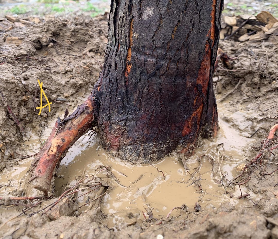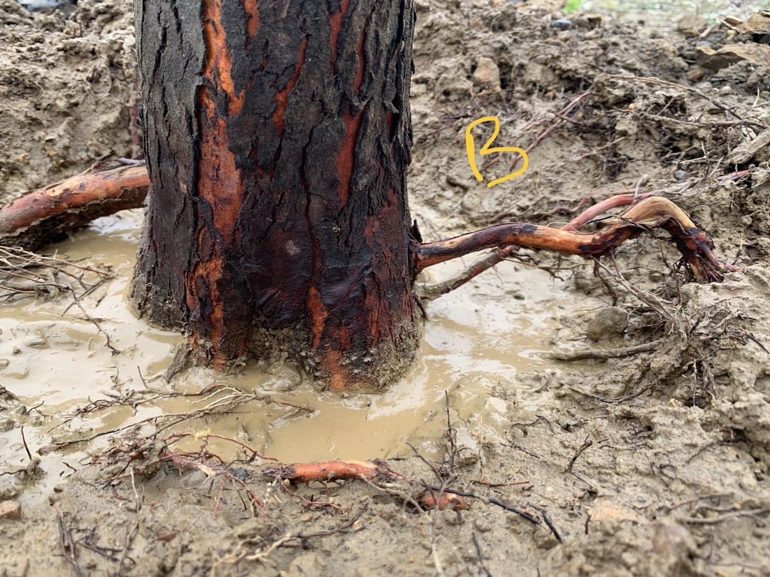 To understand what it means to expose your root flare, do a subreddit search in r/arborists, r/tree, r/sfwtrees or r/marijuanaenthusiasts using the term root flare; there will be a lot of posts where this has been done on young and old trees. You’ll know you’ve found it when you see **outward taper at the base of the tree** from vertical to the horizontal, **and the tops of large, structural roots**. Here’s[ a post from last year](https://old.reddit.com/r/arborists/comments/vn492d/) for an example of what finding the flare will look like. Here’s another [post from two years back about this](https://old.reddit.com/r/arborists/comments/jgnhji/rate_my_root_flare/); note that this poster found bundles of adventitious roots before they got to the flare, like those fibrous roots you’re seeing now (theirs was an apple tree) and a clear structural root which is visible in the last pic in the gallery.