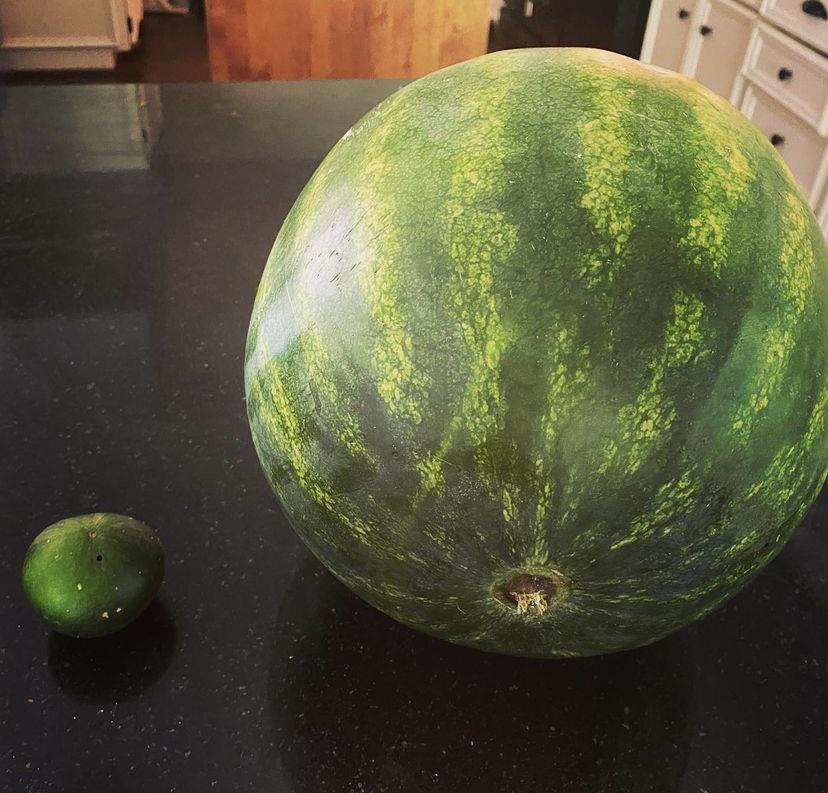 I can see the lumpiness on the one on the right which tells me it’s home grown as stores refuse to buy anything not smooth round. Considering the only two types sold in the store near me are Triple Crown Seedless and Sugar Baby, I’m gonna guess you found a seed in a Triple Crown seedless watermelon and planted it. If that’s true then you are like me as that’s exactly what I did and now have lots of f2 hybrid fruits growing as well as a huge stock of f3 hybrid seeds.