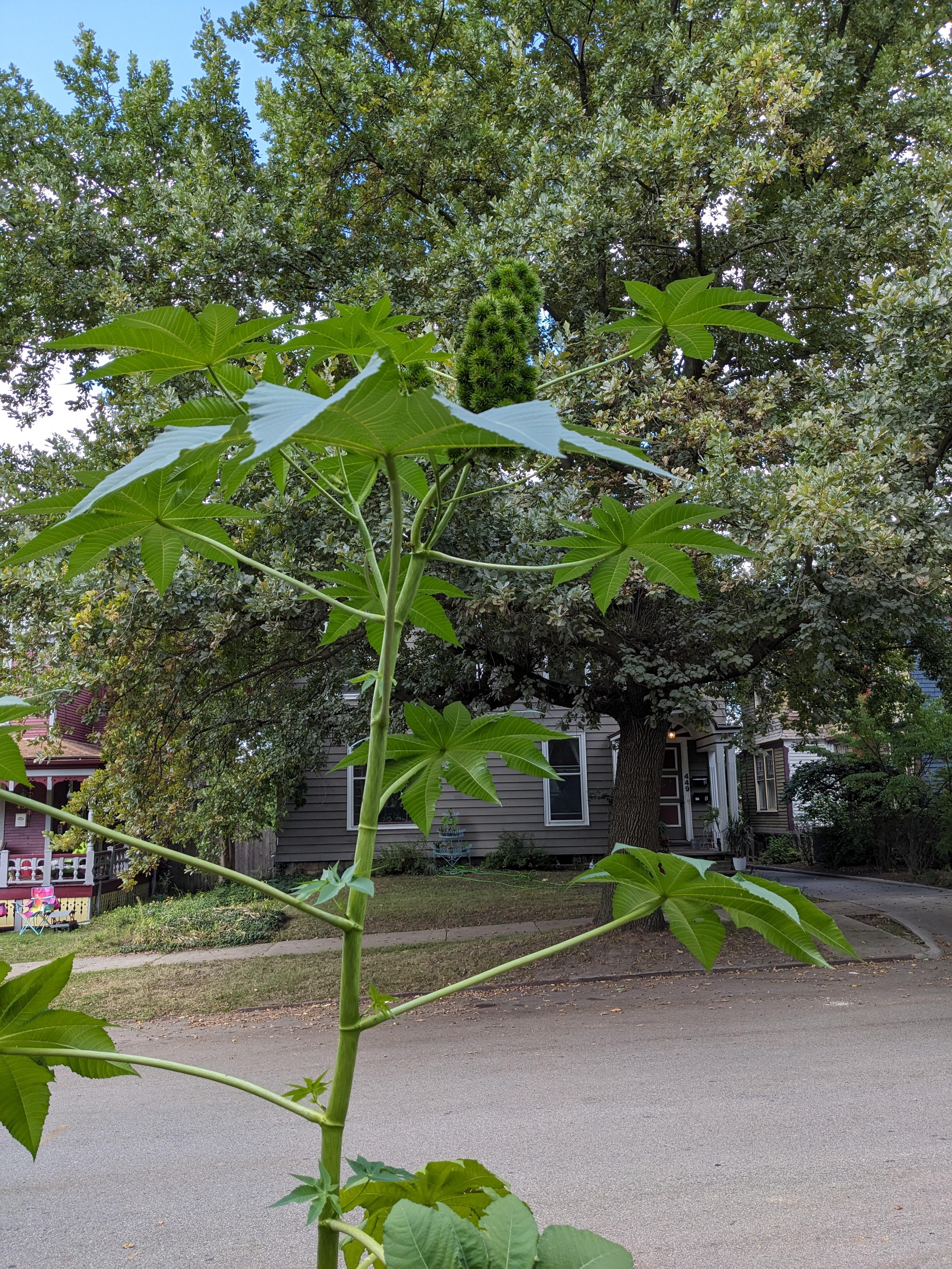 *Ricinus communis* / the infamous castor bean. It has some ornamental cultivars that are stunning, but be sure to prune off and dispose of any fruit, as it is incredibly toxic.