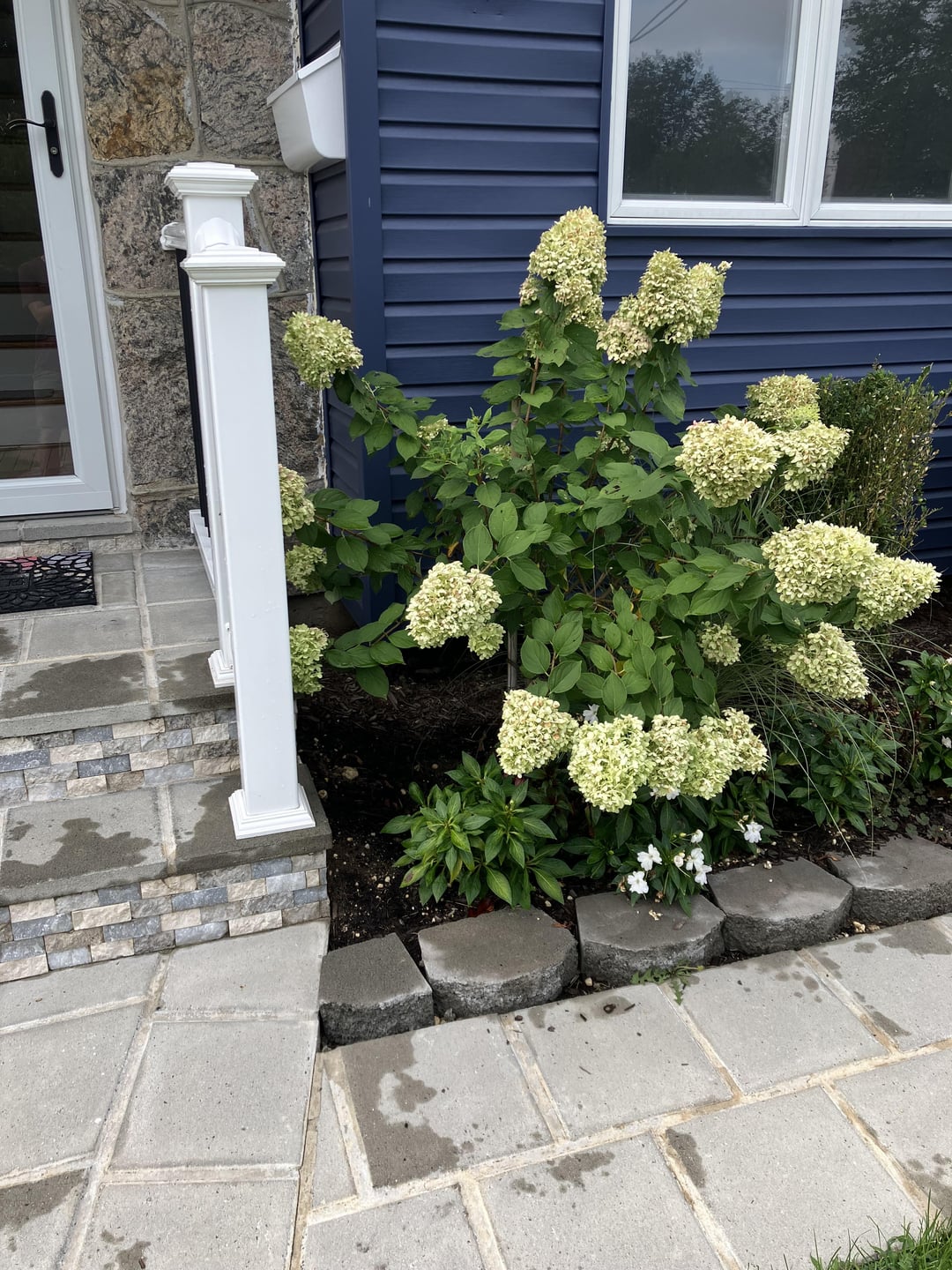 Your panicle hydrangea cultivar- and this looks like a Limelight or a Little Lime, age to a dull green color. You’ve taken great care of it; when not watered enough, the blossoms can turn brown. As the shrub enters dormancy, the blossoms will turn brown at that time. Winter interest! Prune off in early to mid spring.