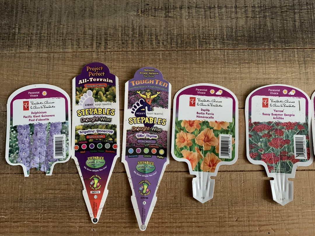 Anemone, geranium, dianthus, butterfly weed, blue catmint, Jack of diamonds, autumn fire stonecrop, hemerocallis, yarrow, ice plants.