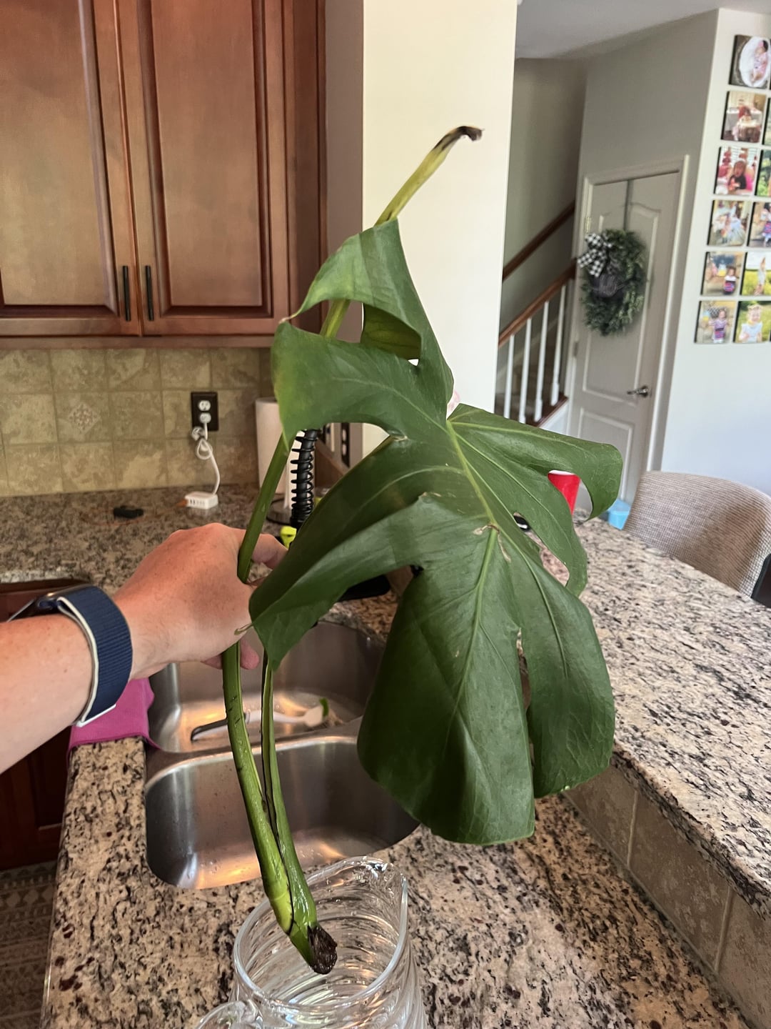 This was either a poor poor top cut or a mid cut that activated a massive immediate growth point, would lean the former. In that case the little tip sticking out right next to your thumb is a new leaf coming in! Once that comes in if you don’t like the look of the stem you could cut that off, but I would at least wait until the petiole separates itself so you would more just be cutting off a leaf that never formed if that makes sense!