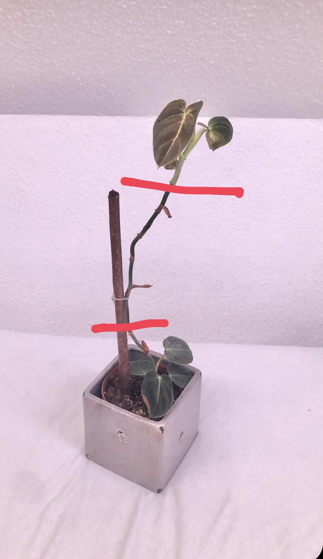 My baby Philodendron Melanochrysum has lost alot of leafs in the middle part. Can I cut along the red lines and propegate the upper part of the plant? by ernstfeind AraceaearoidsArums Write A CommentYou must be logged in to post a comment.