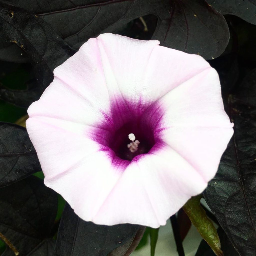 Sweet potatoes (tuberous roots) 🍠 produce vigorous growing stems, tropical-esque foliage and these dramatic blooms 🙌 And best of all they are super easy to grow in the summer! Just keep the soil moist. We like this deep purple hybrid ‘Solar Power Black’ #ipomoeabatatas #sweetpotatovine #thehorticultgarden
