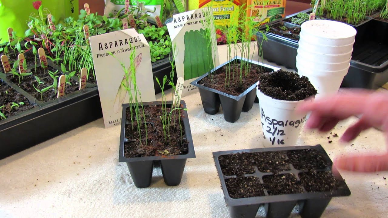 Many people plant Asparagus by planting 1 year old crowns/roots. Once planted you have to wait 3 years before harvesting asparagus spears as to give the roots time to mature and establish. If you start Asparagus by planting seeds in the ground, you may have to wait 4 years before you can harvest. However, if you seed start them indoors you can cut a year off your harvesting wait time.